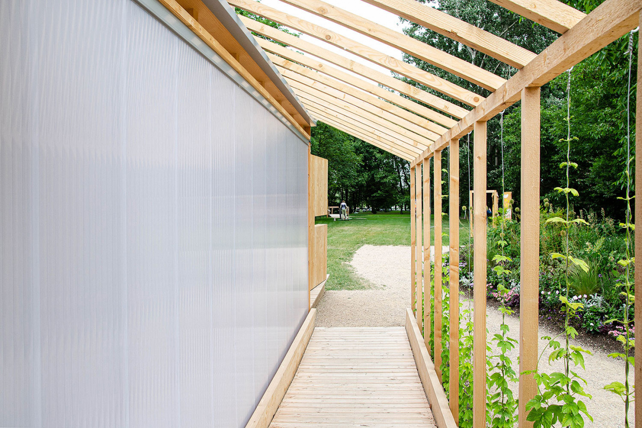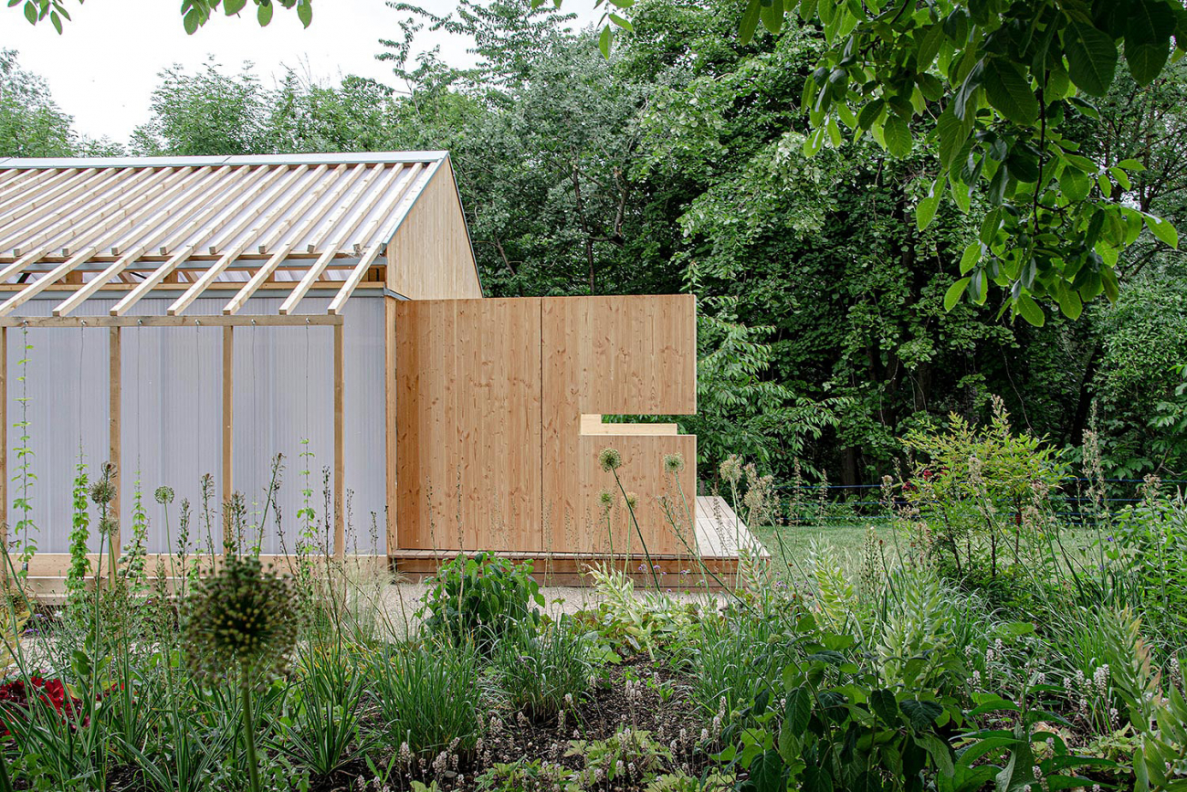 Die Giebelwand ist als Doppelflügeltür konzipiert, so dass sich der Pavillon leicht zur Umgebung hin öffnen lässt. Bei geöffneten Flügeln verschmilzt der Innenraum mit dem Außenraum. Eine Terrasse erweitert den Sitzbereich und dient als Bühne für größere Veranstaltungen. Lüftungsschlitze in den Traufwänden und am First sorgen für ausreichende Durchlüftung und regulieren das Raumklima durch nächtliche Abkühlung.