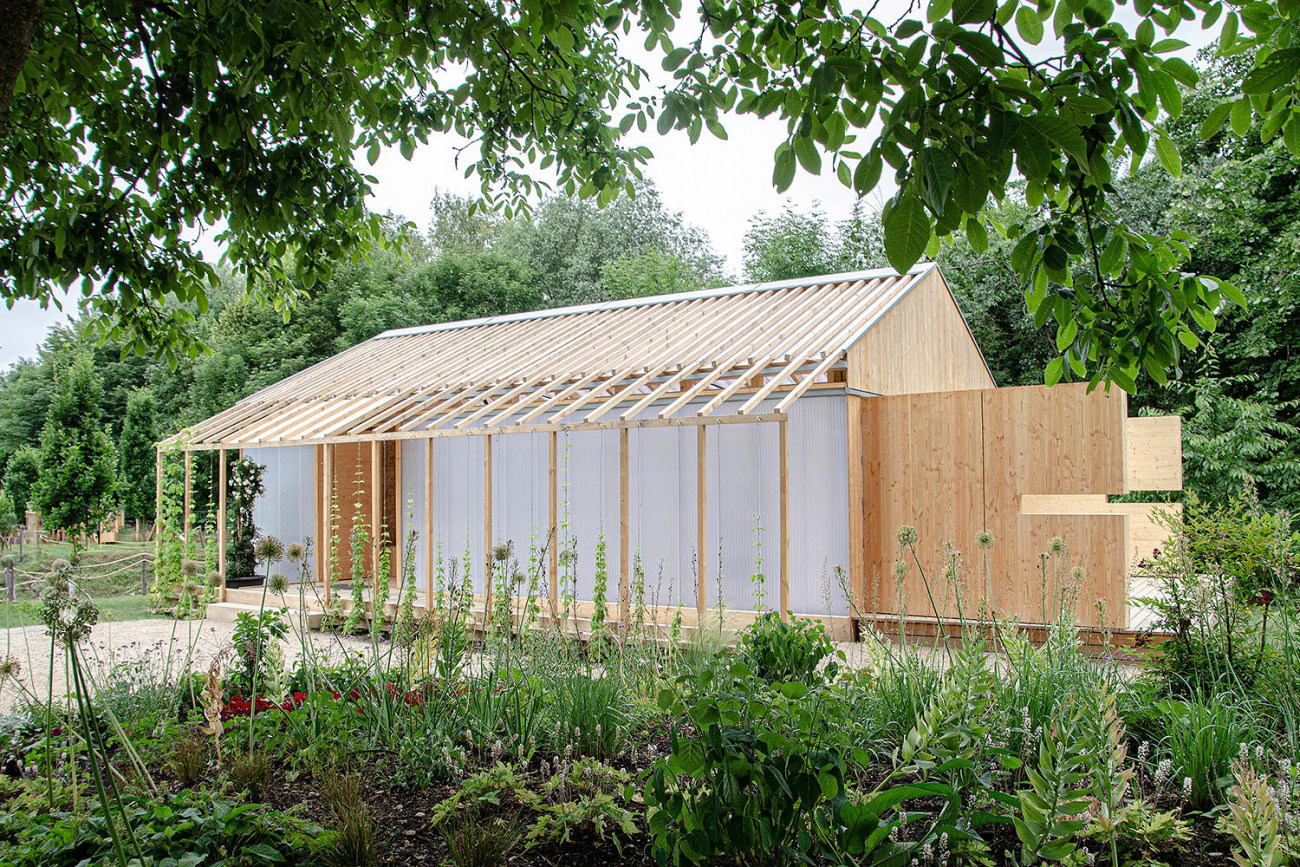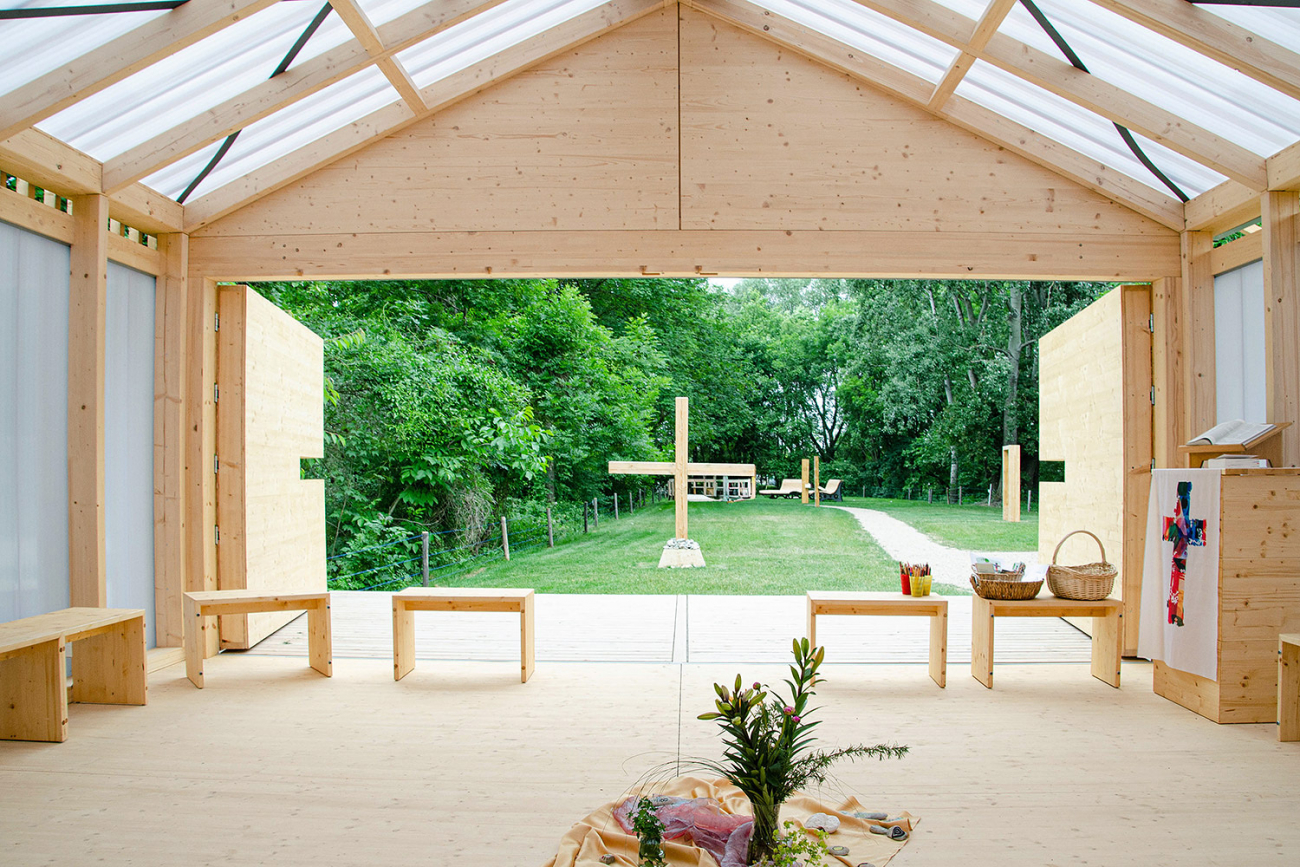 Die Kirchen wünschten sich einen ruhigen Ort für Gottesdienste und Einzelgespräche, einen Pavillon, der an heißen Sommertagen Schatten spendet. Der Pavillon ist introvertiert gestaltet, bietet mit seiner transluzenten Hülle aber zarte Einblicke und sorgt für warmes Licht im Inneren.