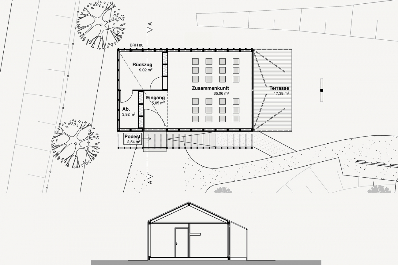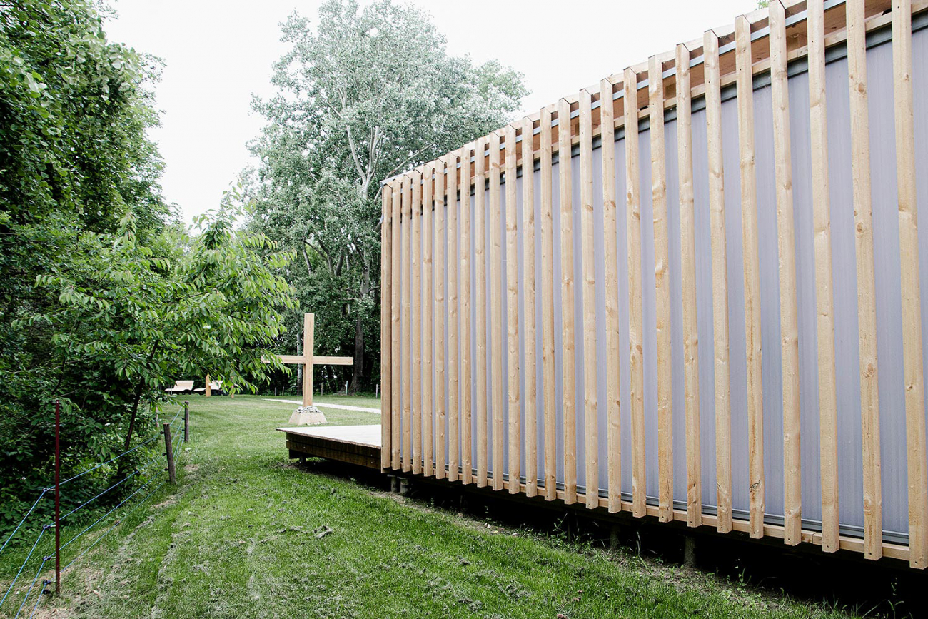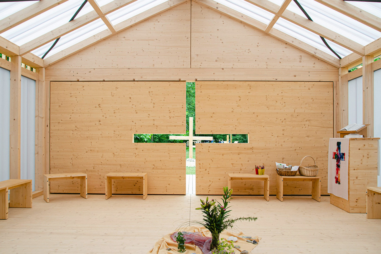 Während eines Gebets können sich die Besucher, abgeschirmt vom Trubel der Landesgartenschau, auf ihren Glauben konzentrieren, was durch einen kreuzförmigen Ausschnitt in der Giebelwand noch intensiviert wird. Eine tiefere Ebene schafft ein in die Landschaft gesetztes Kreuz, das genau auf die Öffnung in der Giebelwand fluchtet.
