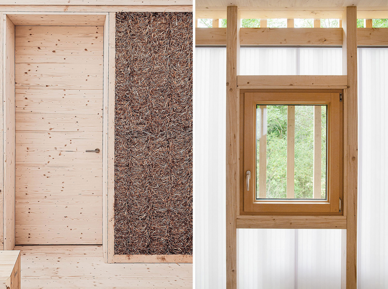 Die Fassade auf der Sonnenseite wird zusätzlich durch eine Begrünung mit Hopfen vor Überhitzung geschützt.