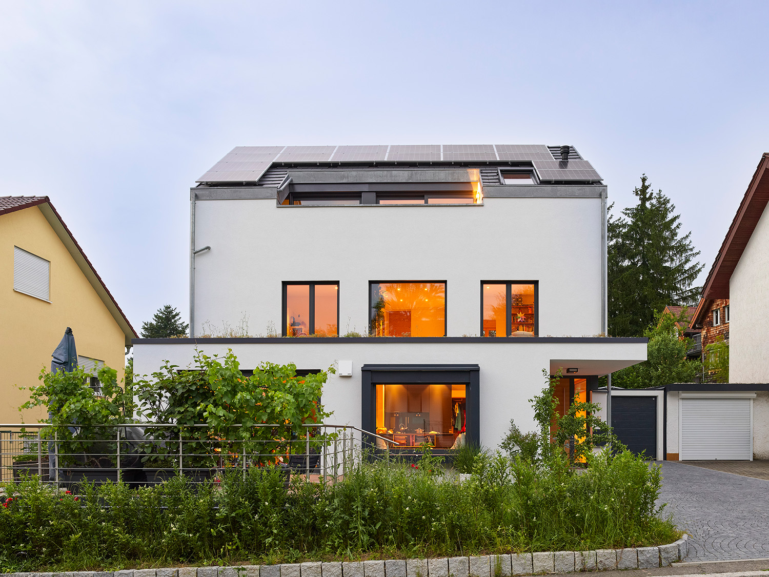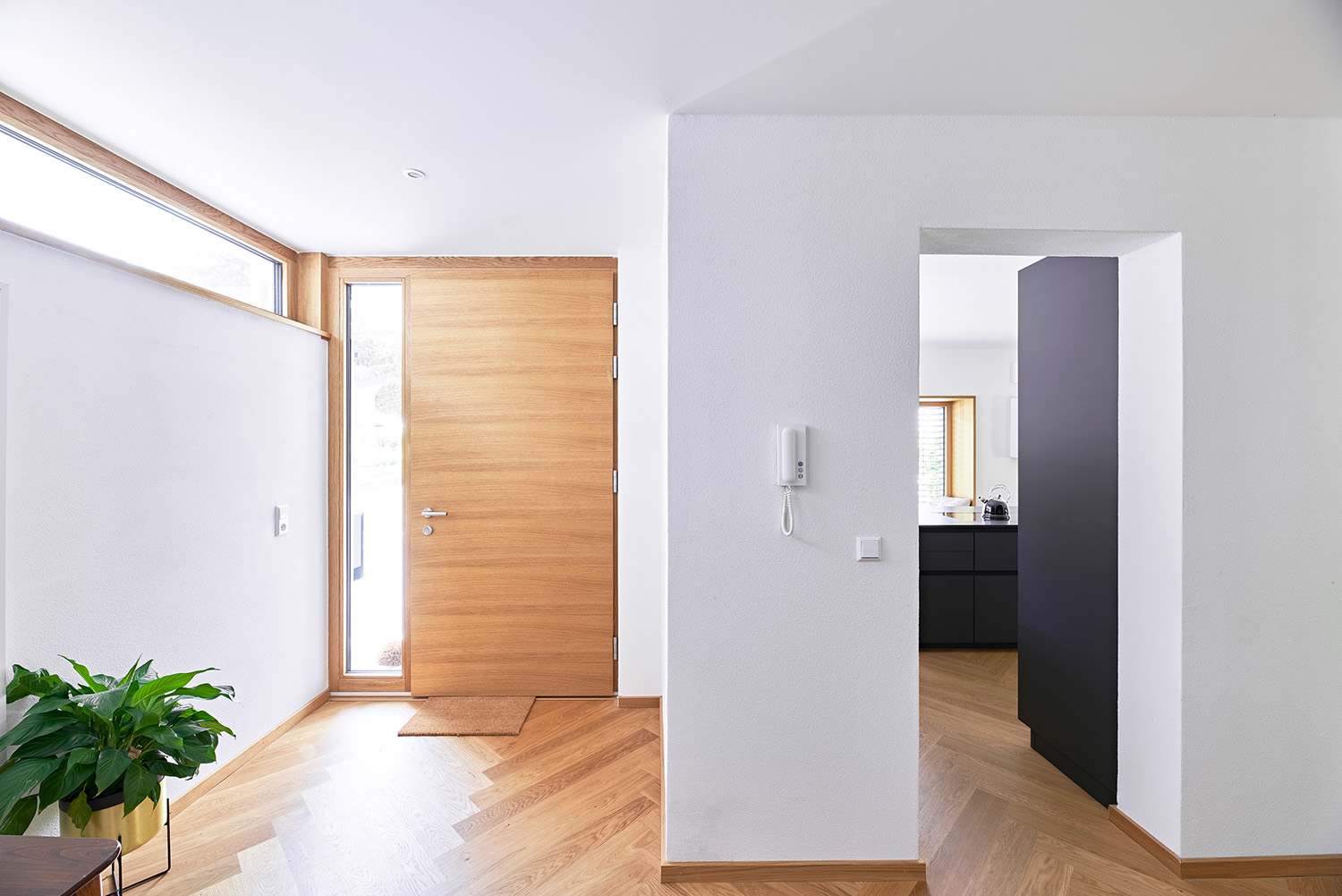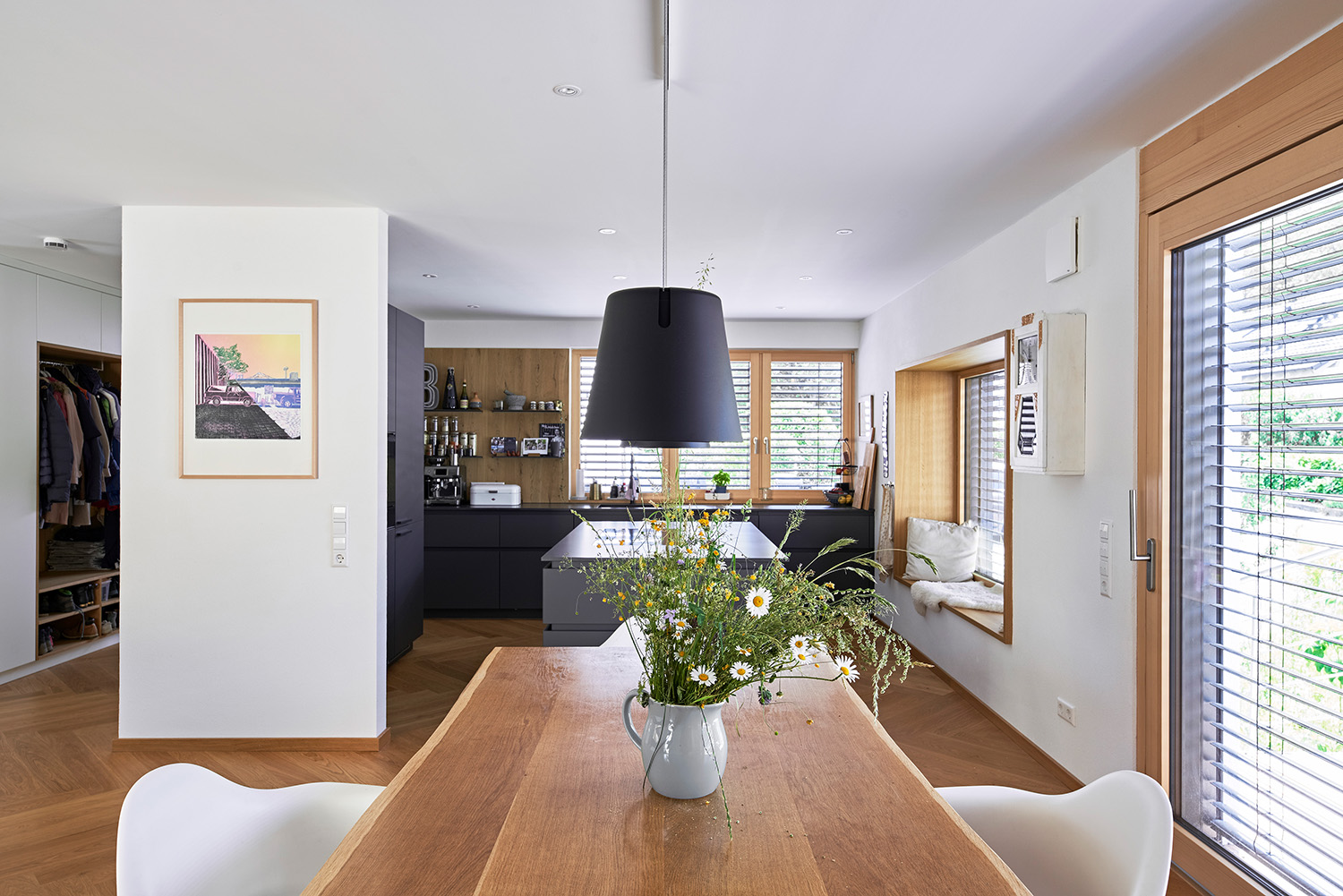 Das bestehende Gebäude aus dem Jahr 1961 wurde bis auf den Keller abgerissen und mit einem Holzhybridbau neu aufgebaut. Die Wohnfläche im Erdgeschoss wurde erweitert, um dem Wunsch eines großen Wohn-, Koch- und Essbereiches zu erfüllen.
