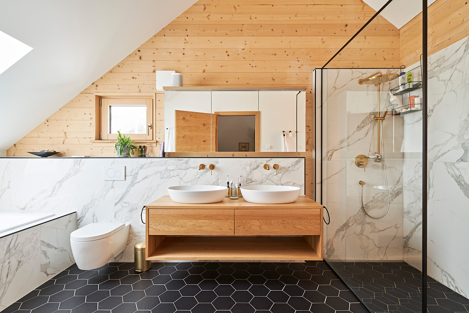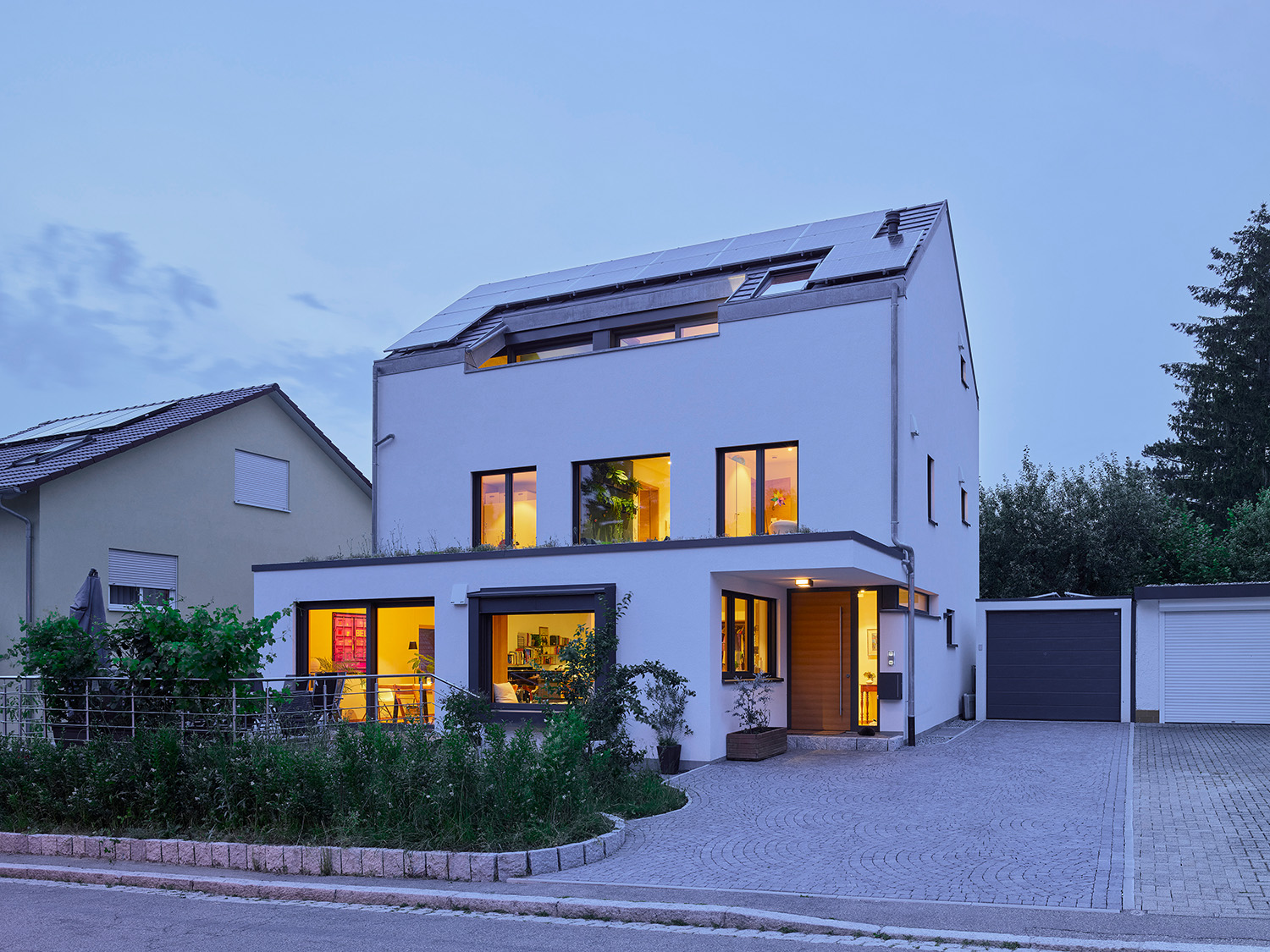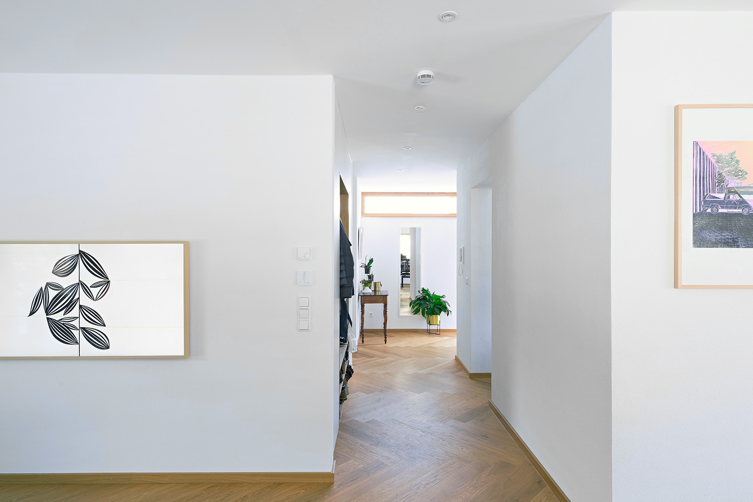 Das bestehende Gebäude aus dem Jahr 1961 wurde bis auf den Keller abgerissen und mit einem Holzhybridbau neu aufgebaut. Die Wohnfläche im Erdgeschoss wurde erweitert, um dem Wunsch eines großen Wohn-, Koch- und Essbereiches zu erfüllen.