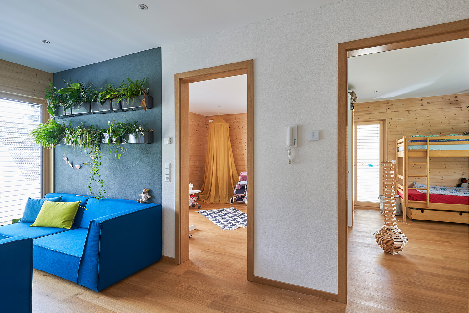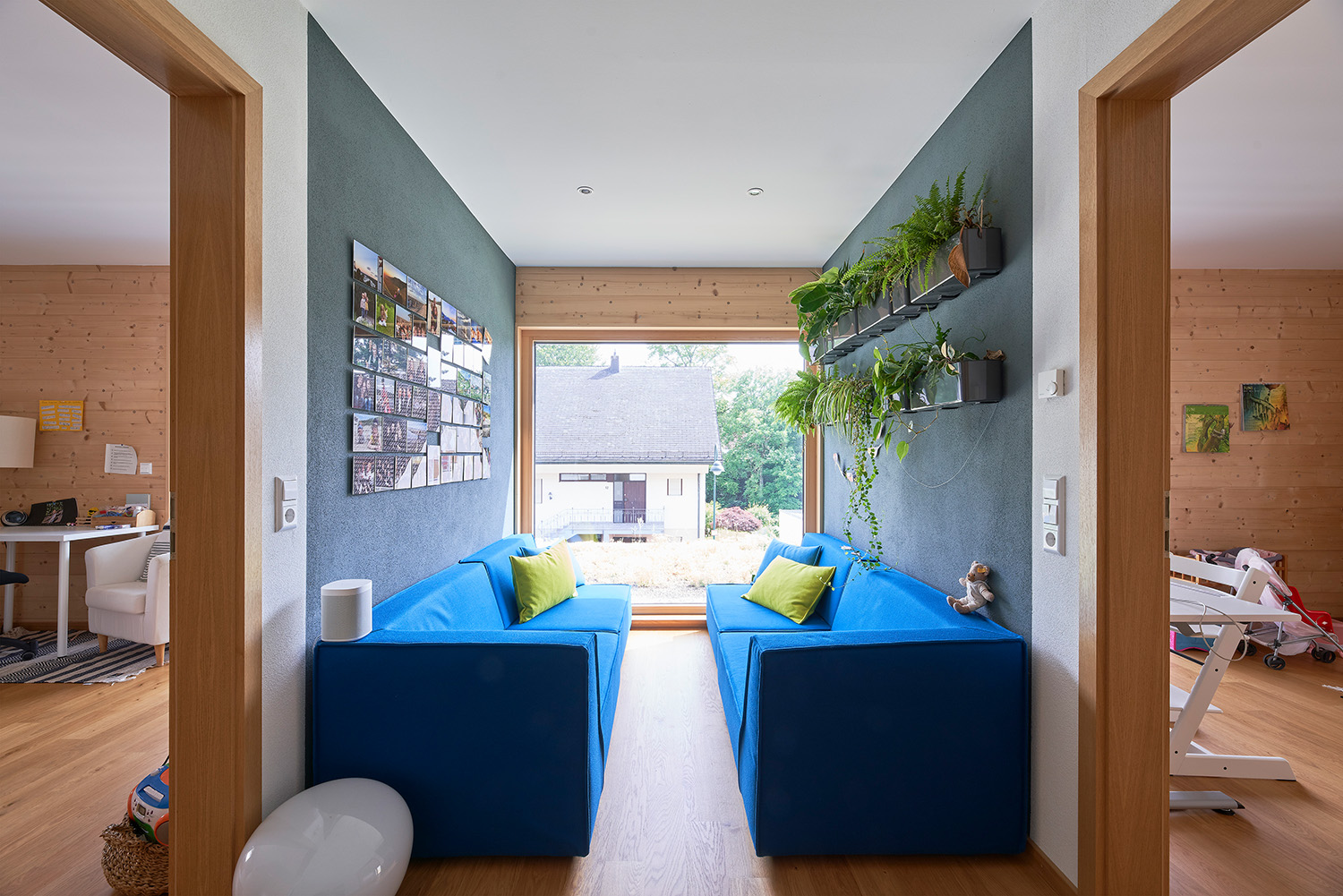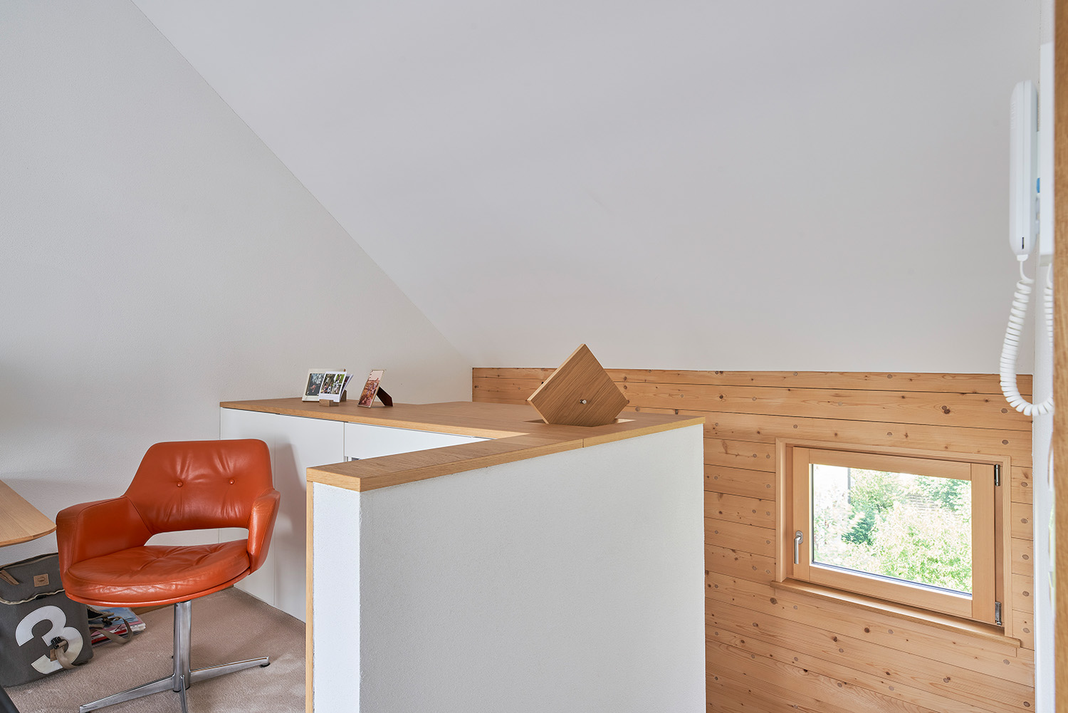 Im Obergeschoss befinden sich die Kinderzimmer mit Bad. Die Flurzone wird als „Chillzone“ für die Kinder genutzt von der eine wohnliche Treppe mit Einbaumöbeln in den Bereich der Eltern führt. Es ist möglich den unteren Bereich der Kinder mit einer Schiebetür zu schließen, somit können die Eltern den Homeofficebereich im Dachgeschoss ungestört nutzen.