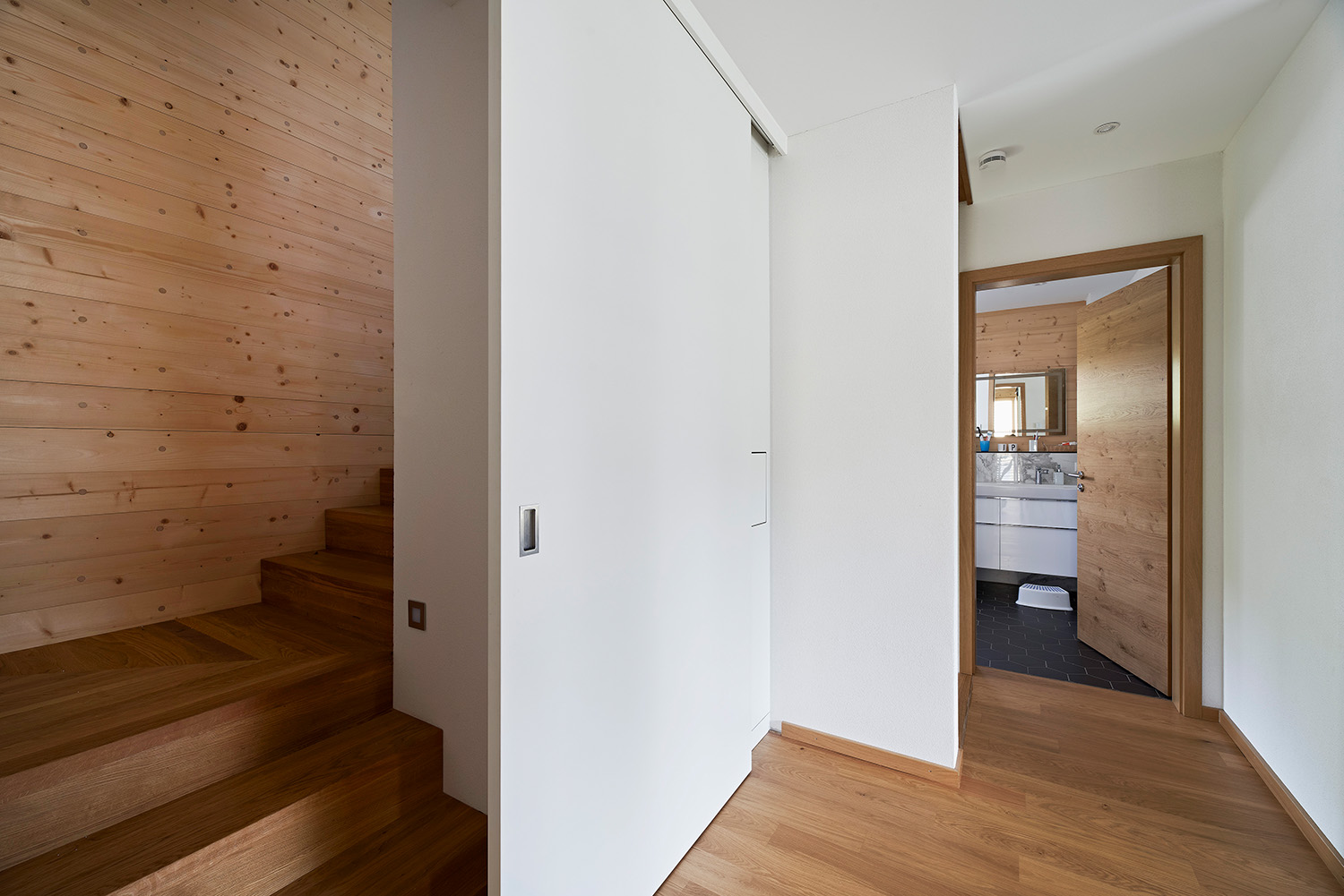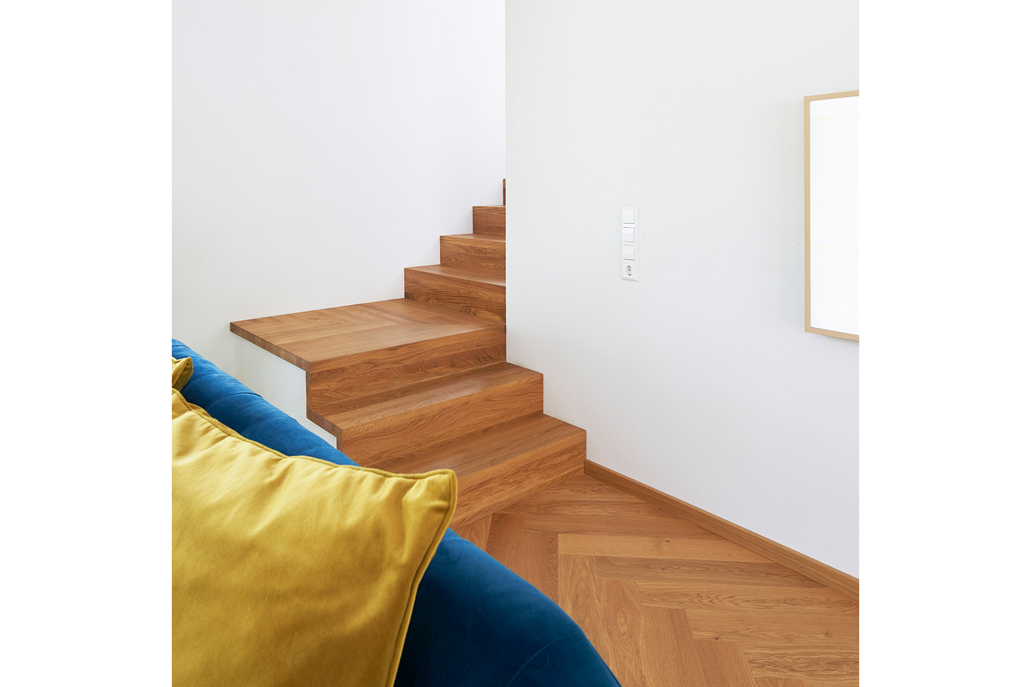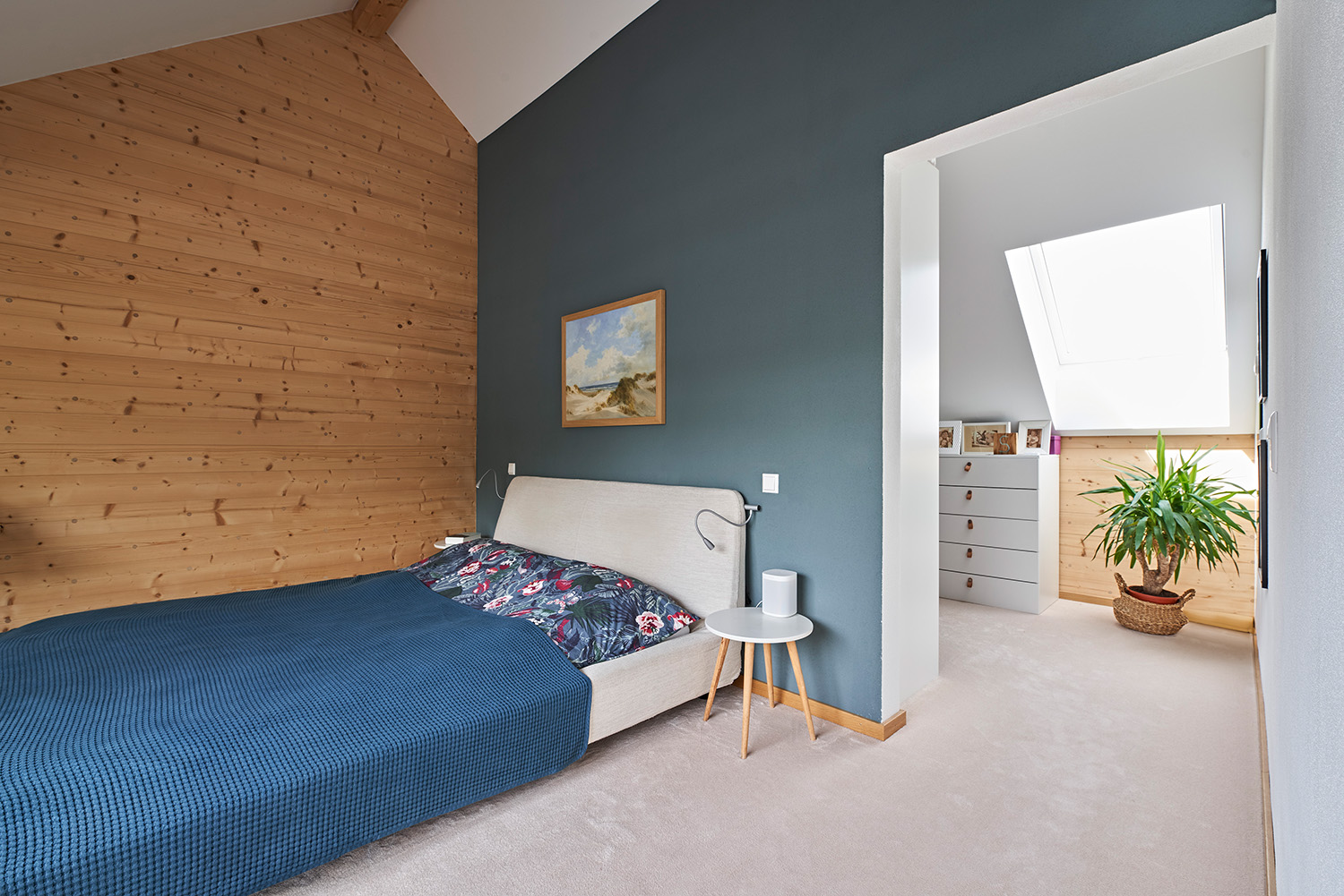 Im Obergeschoss befinden sich die Kinderzimmer mit Bad. Die Flurzone wird als „Chillzone“ für die Kinder genutzt von der eine wohnliche Treppe mit Einbaumöbeln in den Bereich der Eltern führt. Es ist möglich den unteren Bereich der Kinder mit einer Schiebetür zu schließen, somit können die Eltern den Homeofficebereich im Dachgeschoss ungestört nutzen.