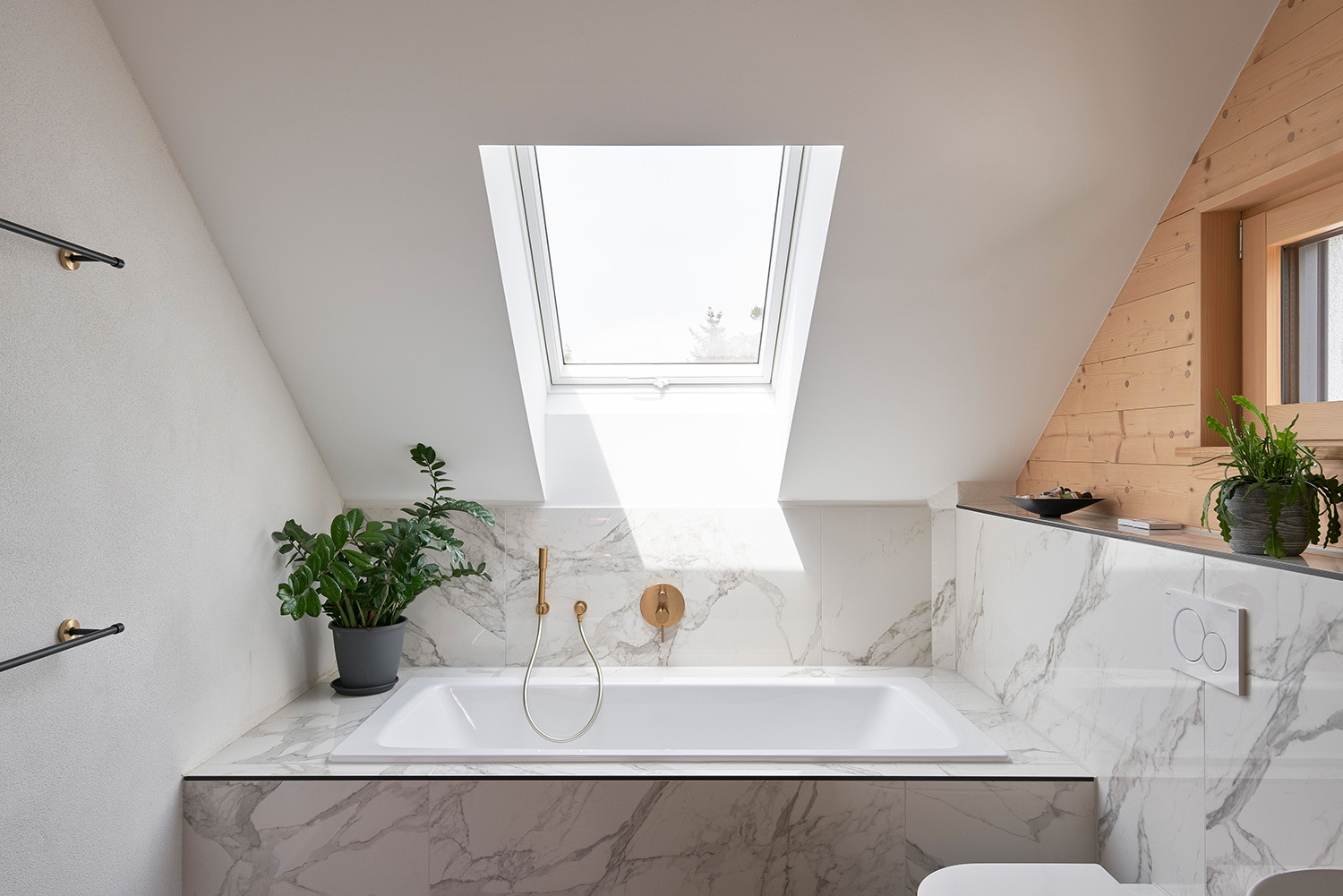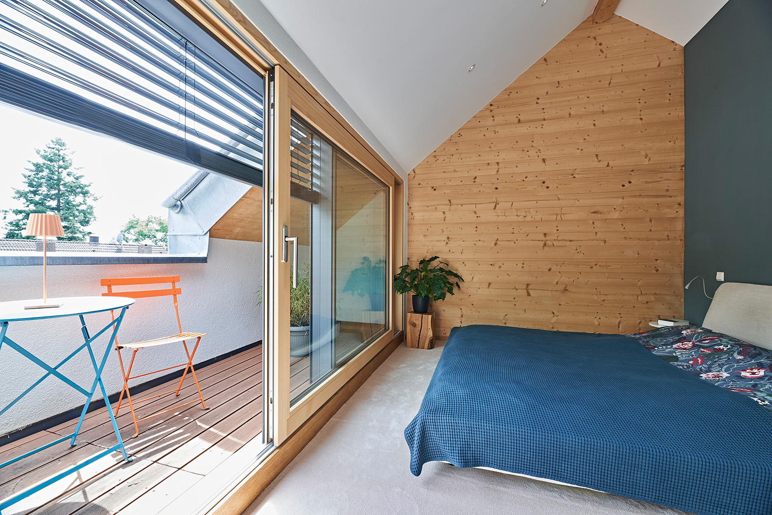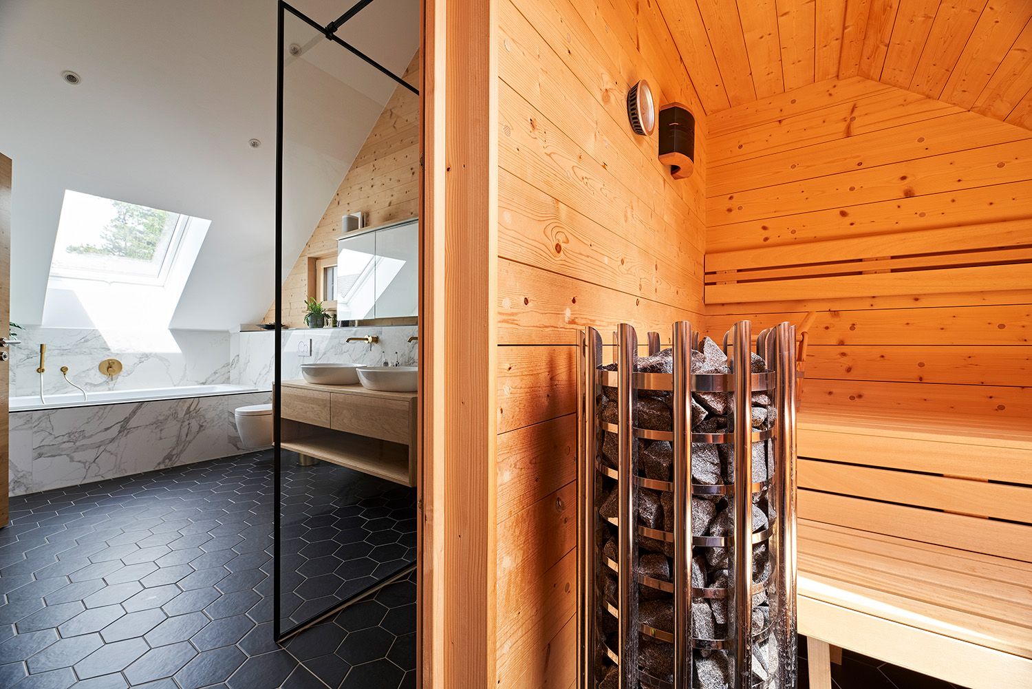 Sauna und eine Terrasse im Dachausschnitt bieten den Bewohnern viel Privatsphäre und eine vielseitige Nutzung, dafür wurde das neue Gebäude in der Höhe etwas angehoben.