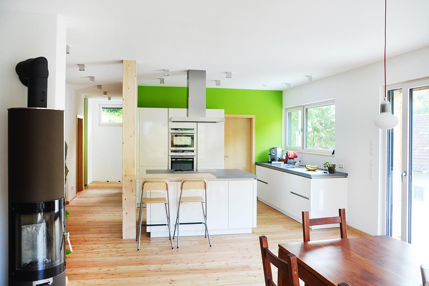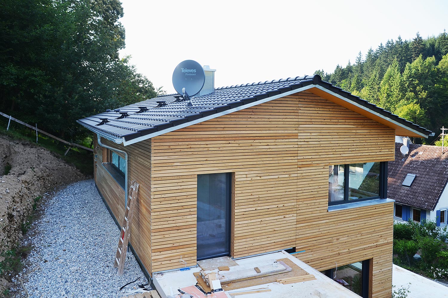 Die anderen Außenwände und das Obergeschoss wurden vollständig in Holzständerbauweise erstellt.