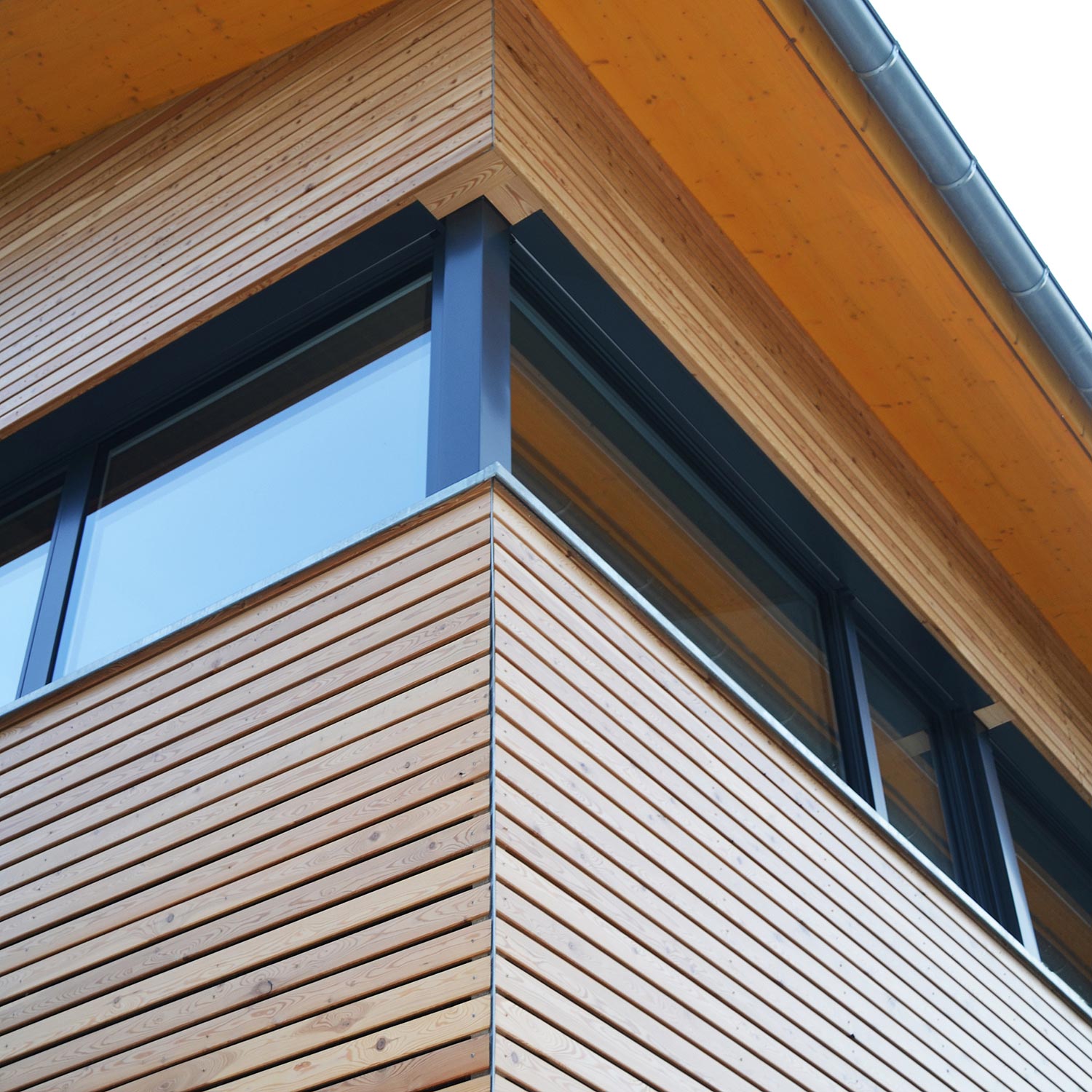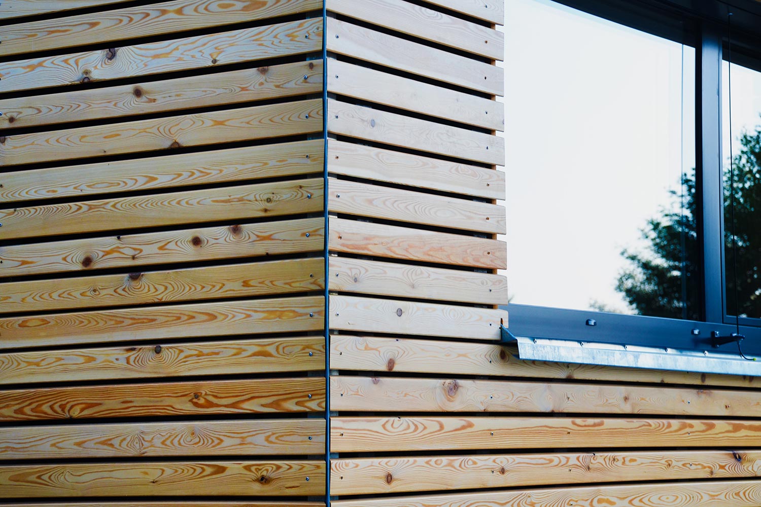 Im Außenbereich ist dies klar erkennbar über die Putzfassaden und die offene Leistenschalung.