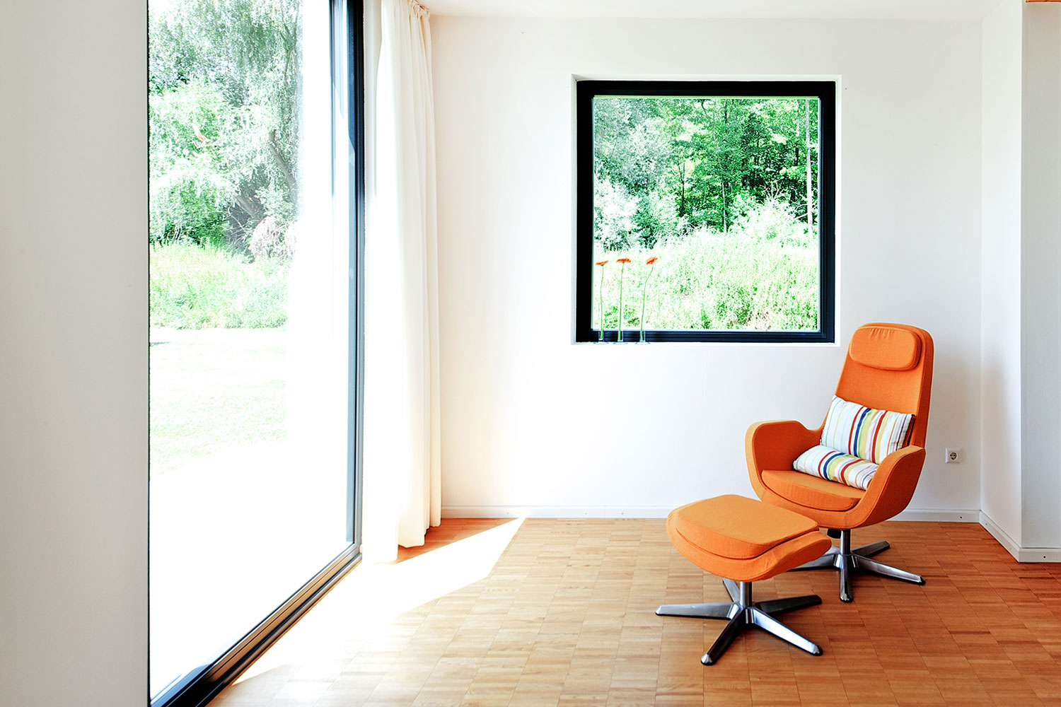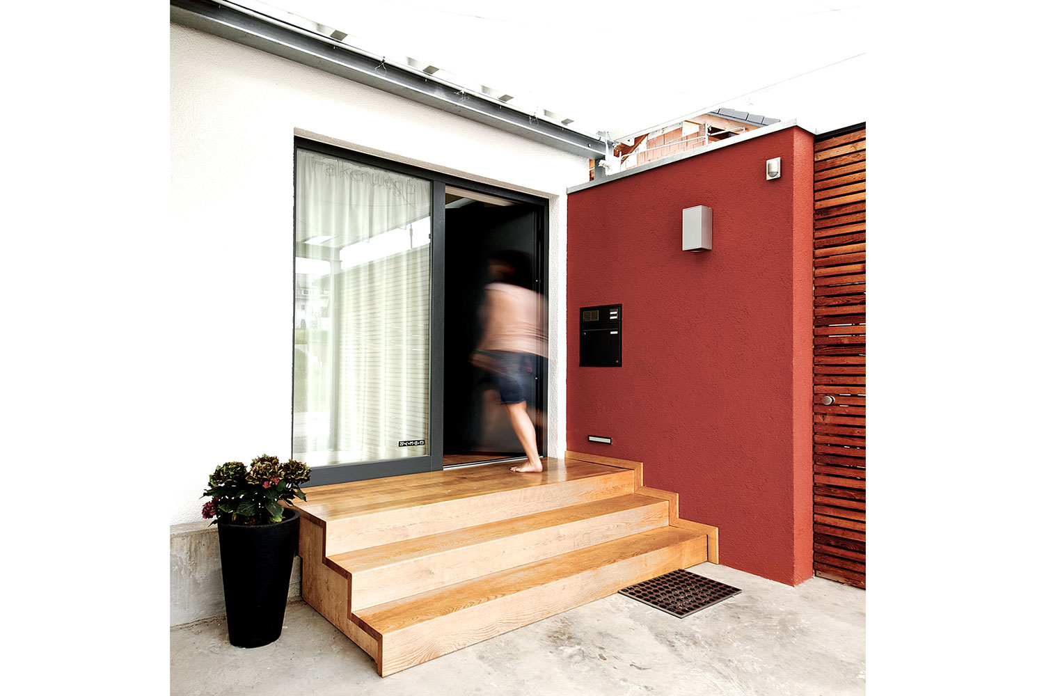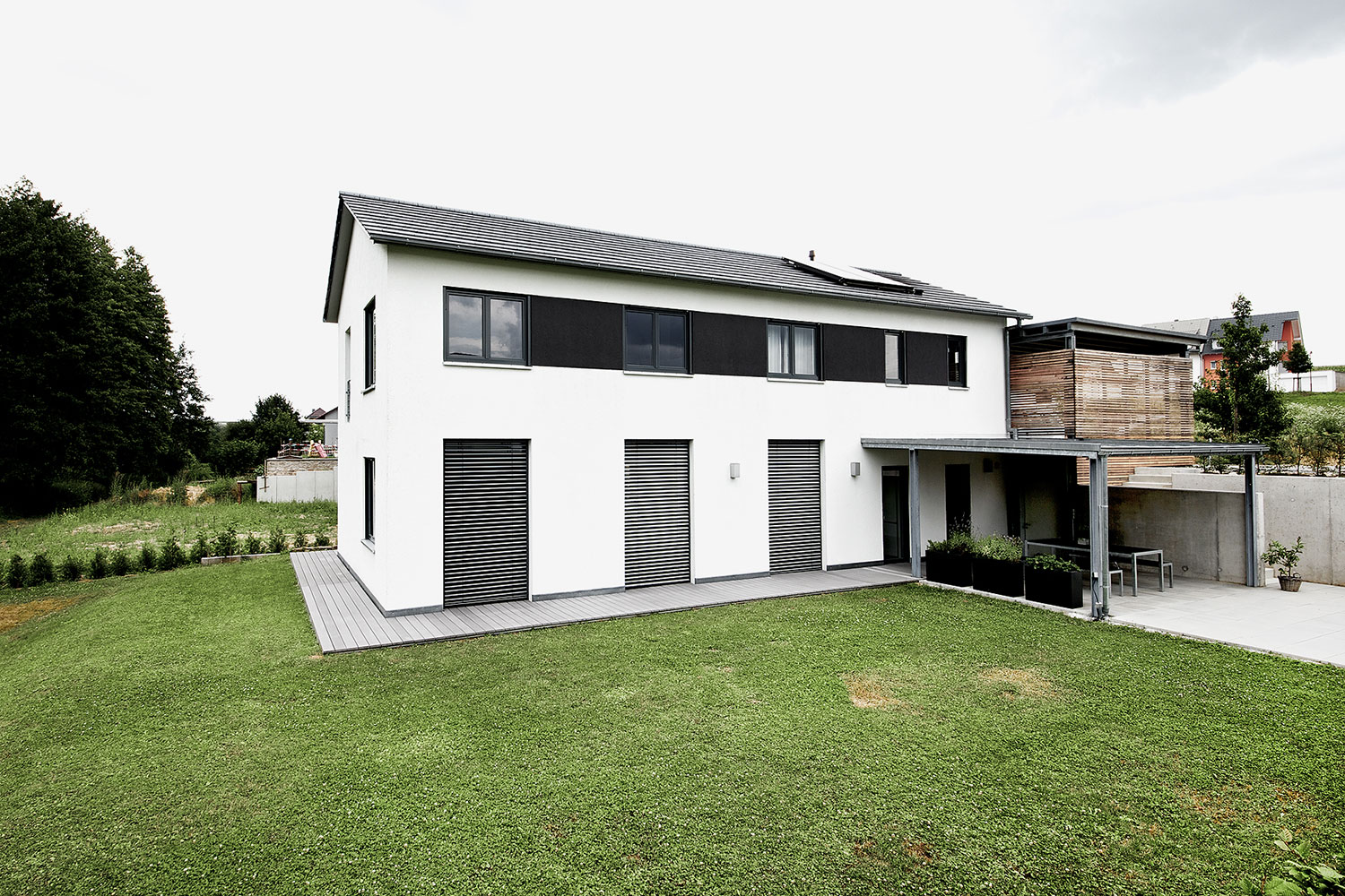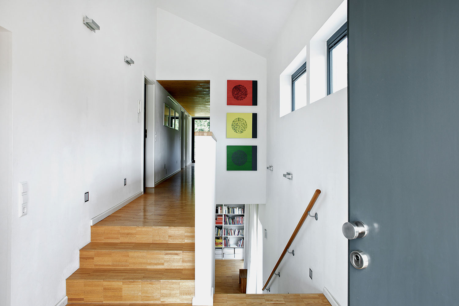 Das Haus in Münzesheim wurde für eine Familie mit 4 Personen konzipiert. Der Höhenunterschied zwischen Straße und Grundstück beträgt 2m. Der Eingang von der Straße befindet sich im Obergeschoss.