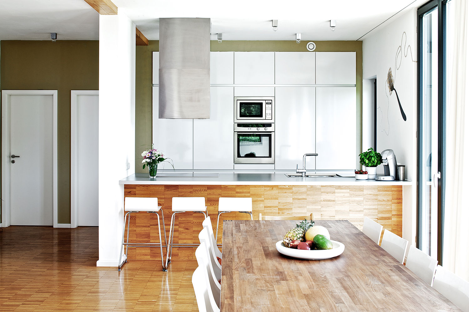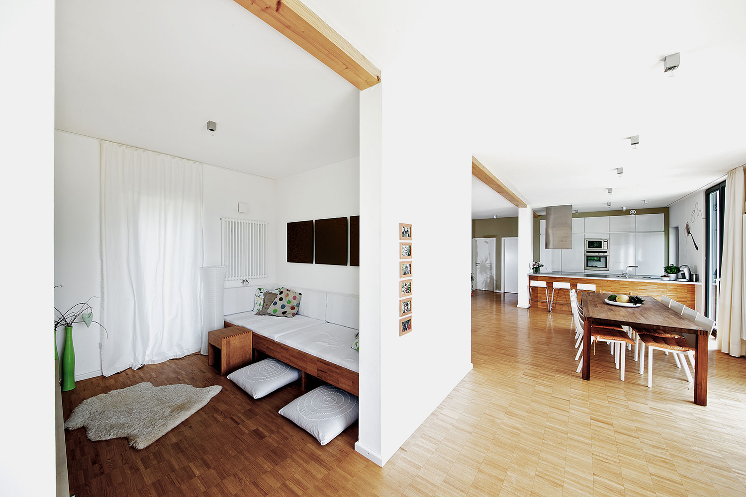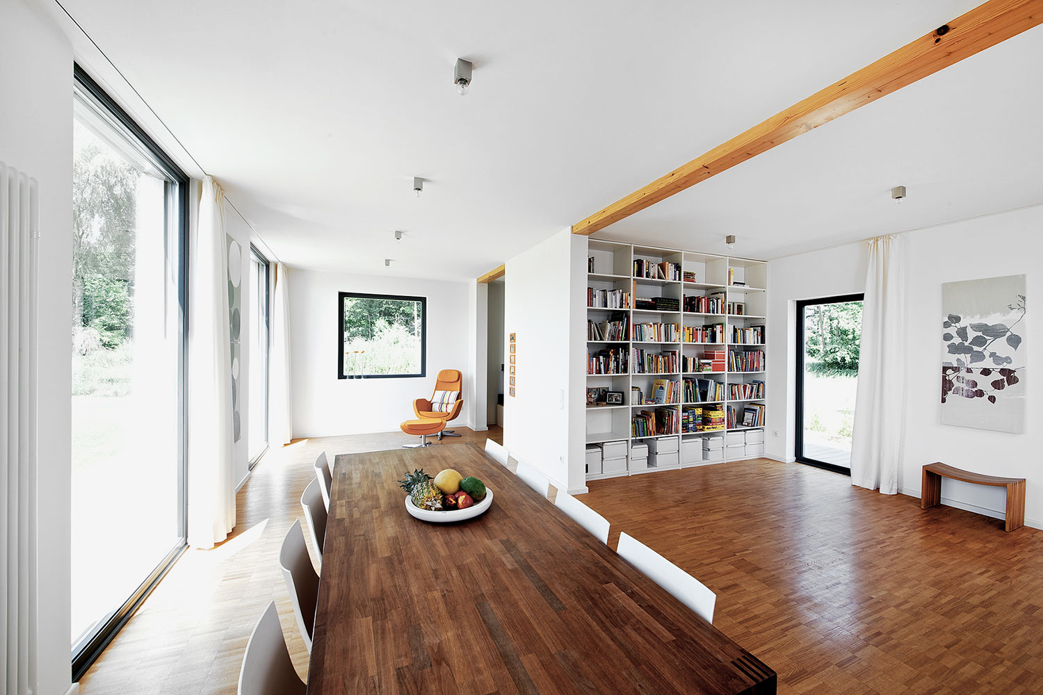 Essen und Wohnen sollten Platz für viele Gäste bieten. Dieser Bereich liegt im Erdgeschoss und hat eine direkte Anbindung an den Garten. Hier gibt es auch einen Bereich für Fernsehen und Lesen, den man abtrennen kann.