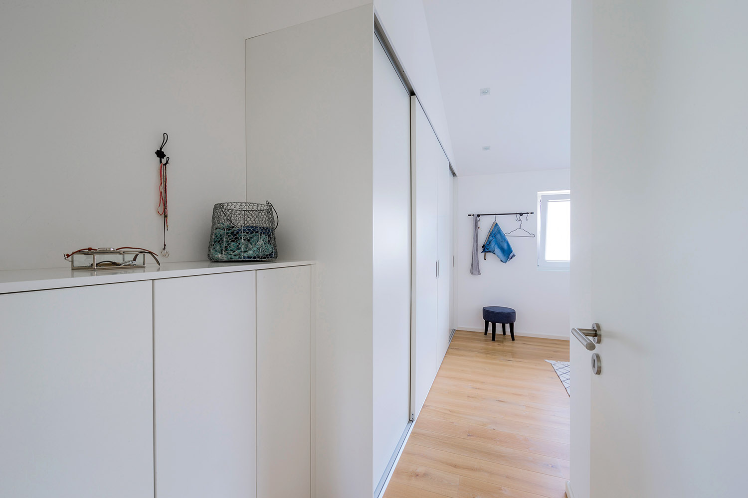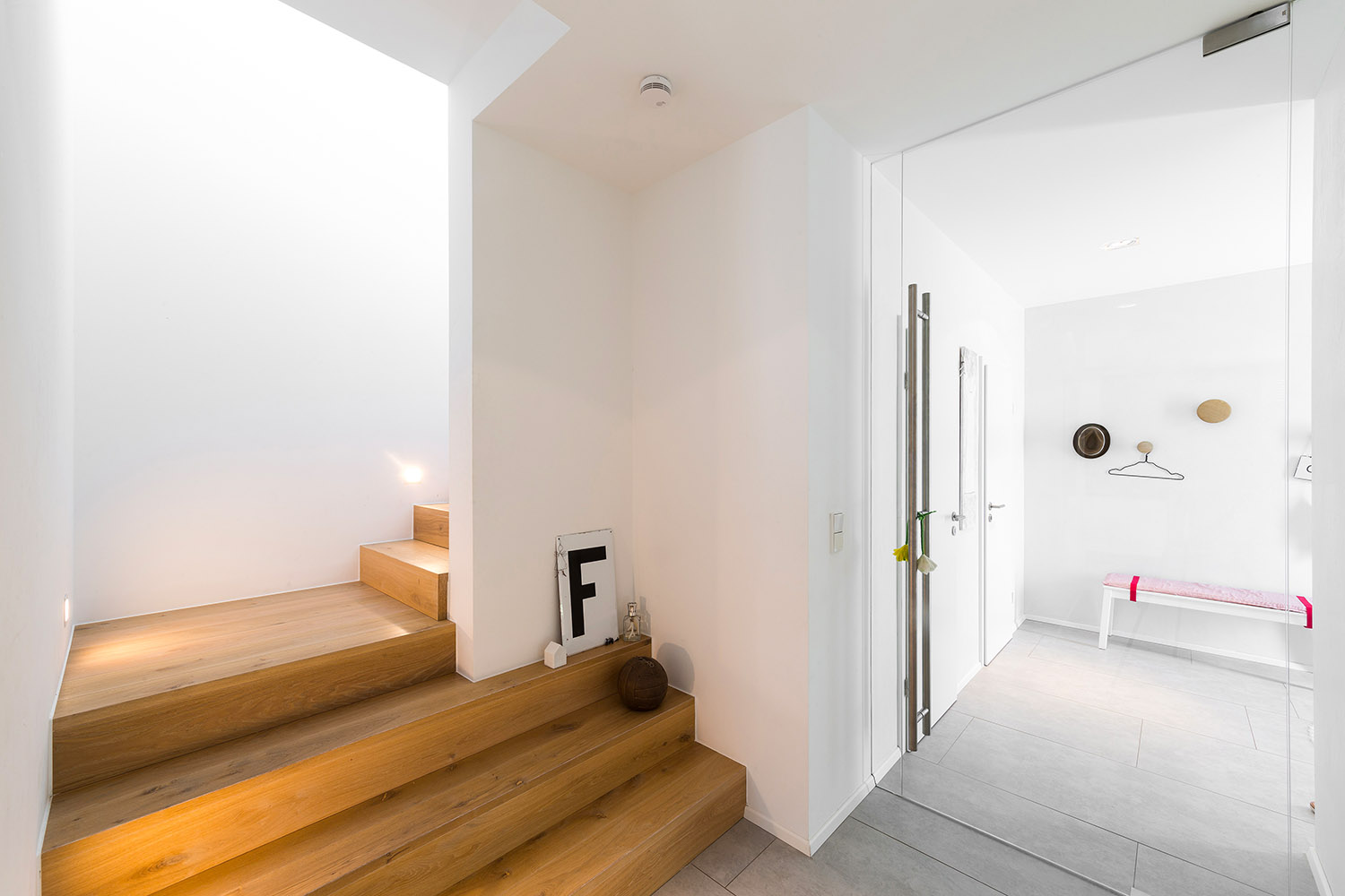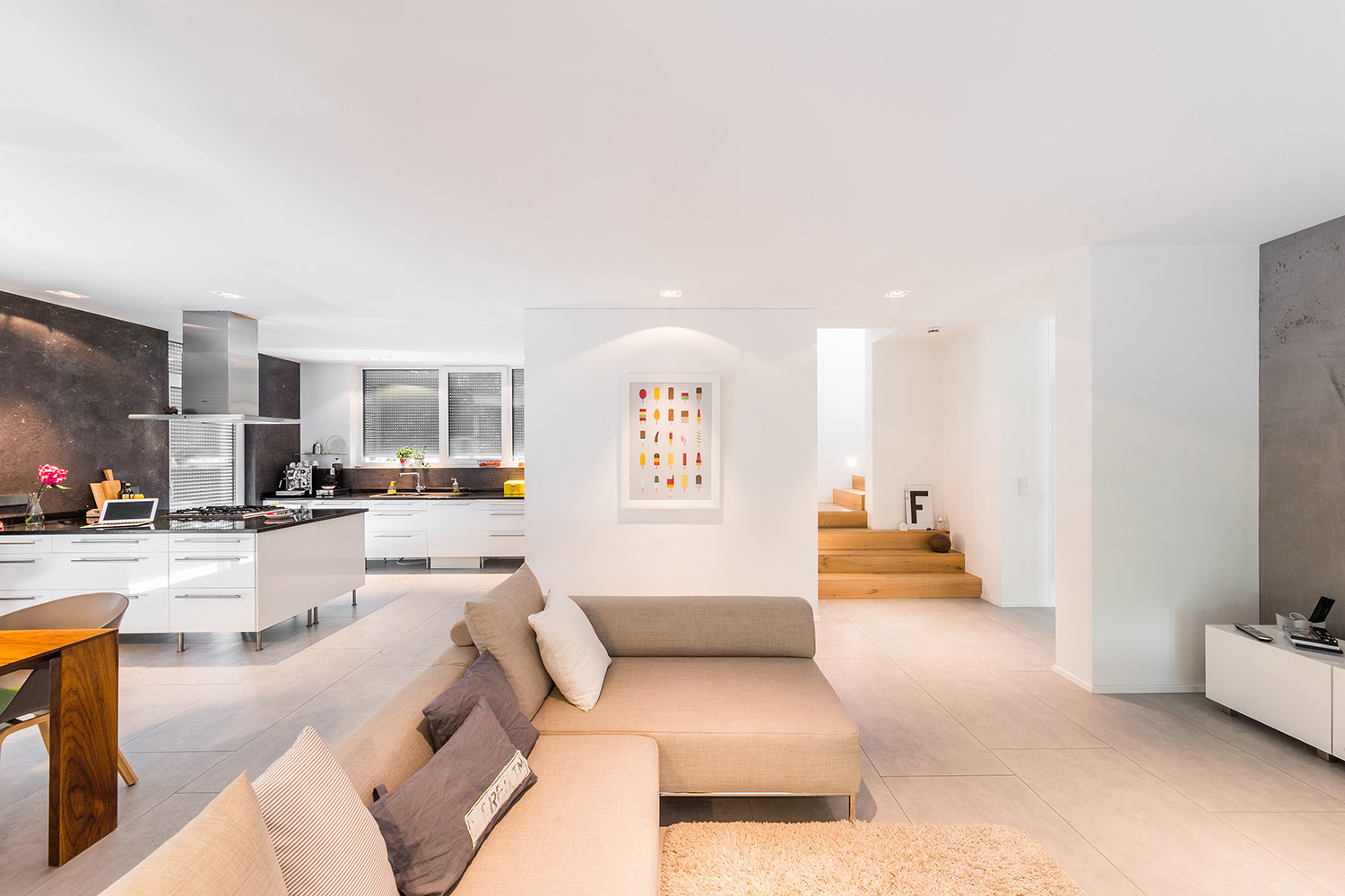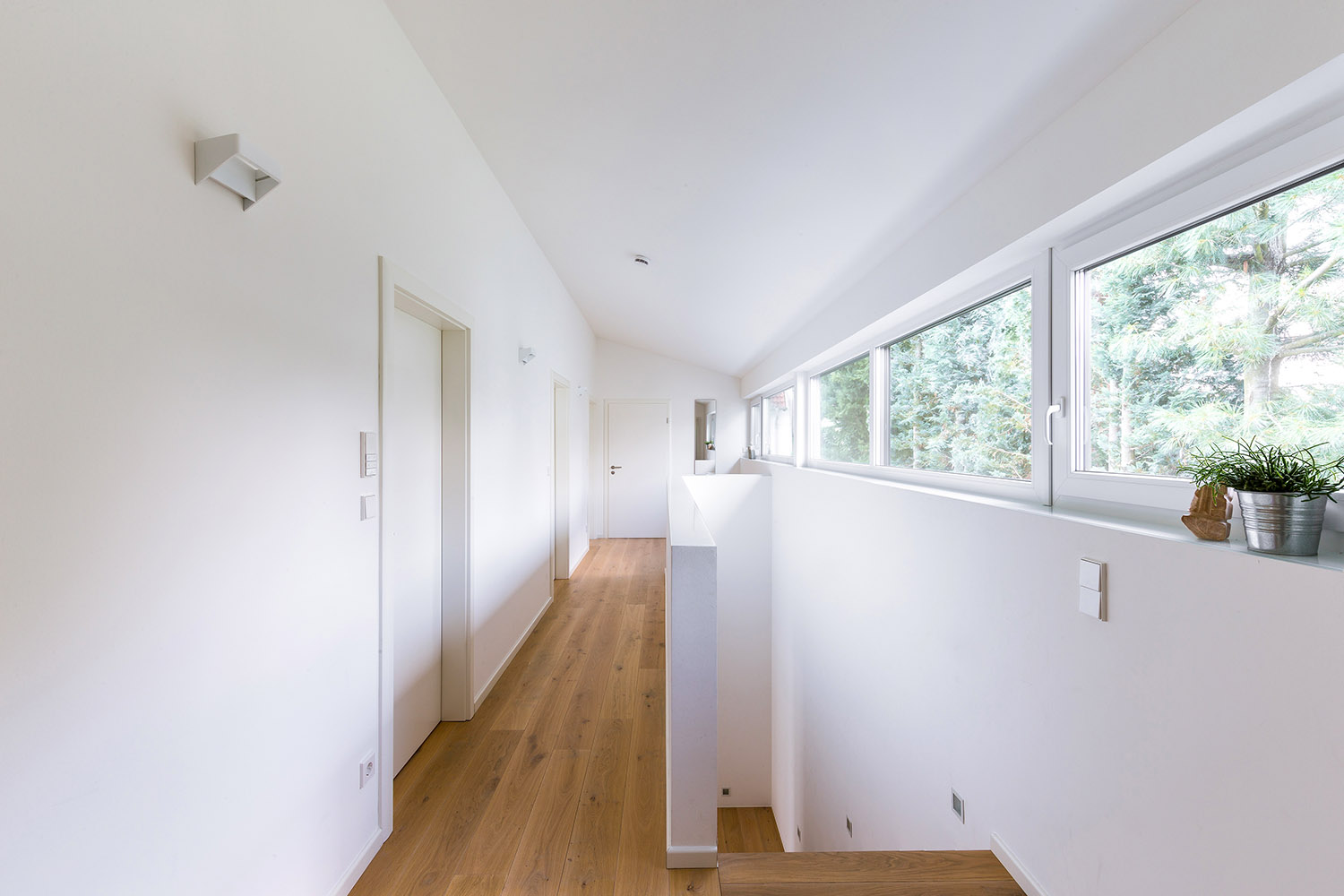 Ein schlichter langer Baukörper mit anschließender Garage und ein in das Wohnhaus integrierter Büroteil folgen der Grundstücksform. Ein Versatz im Erdgeschoß bildet einen geschützten Eingangsbereich aus. Hohe Raumhöhen und deckenhohe Fenster, sowie verschiedene Edelputze und Einbauten sind individuell geplant.