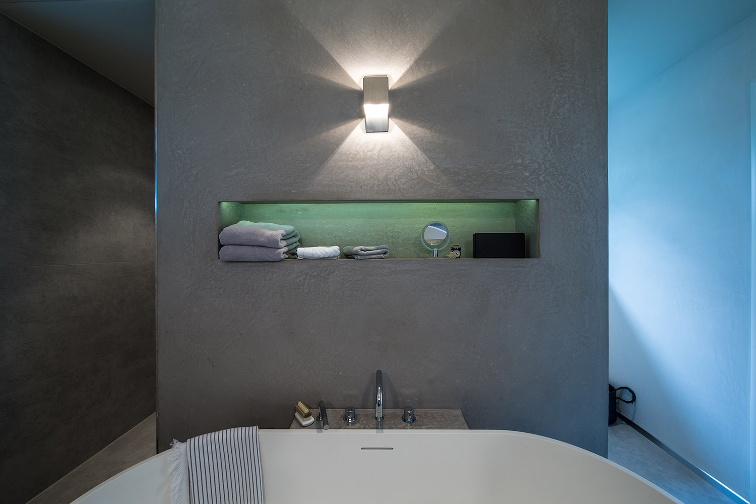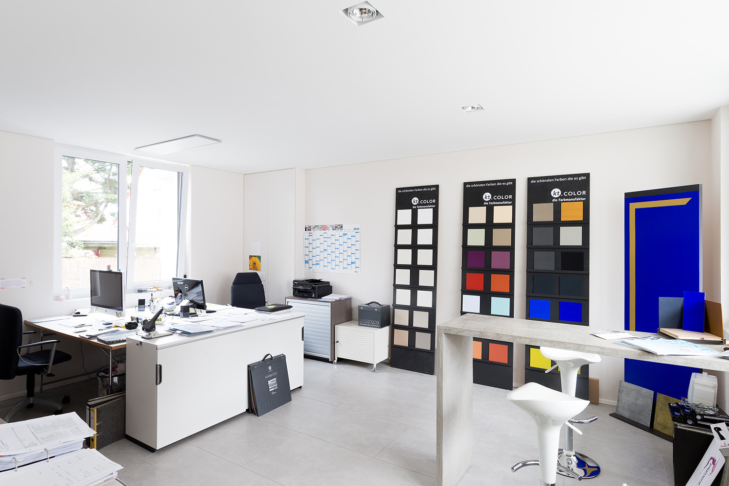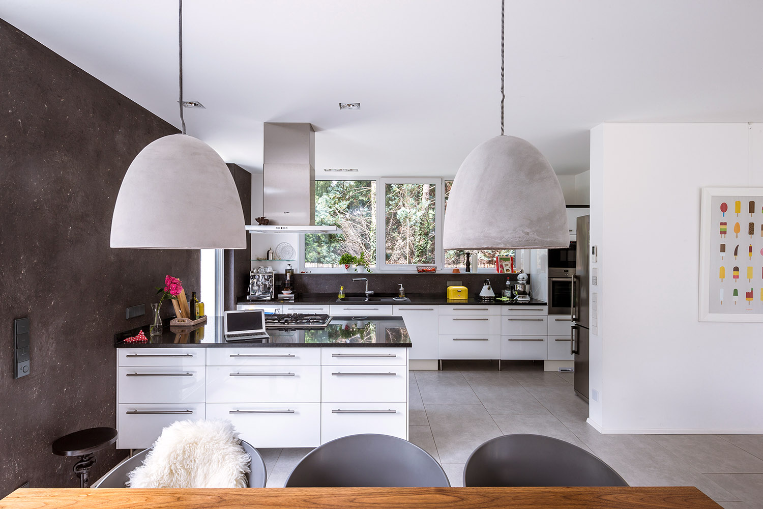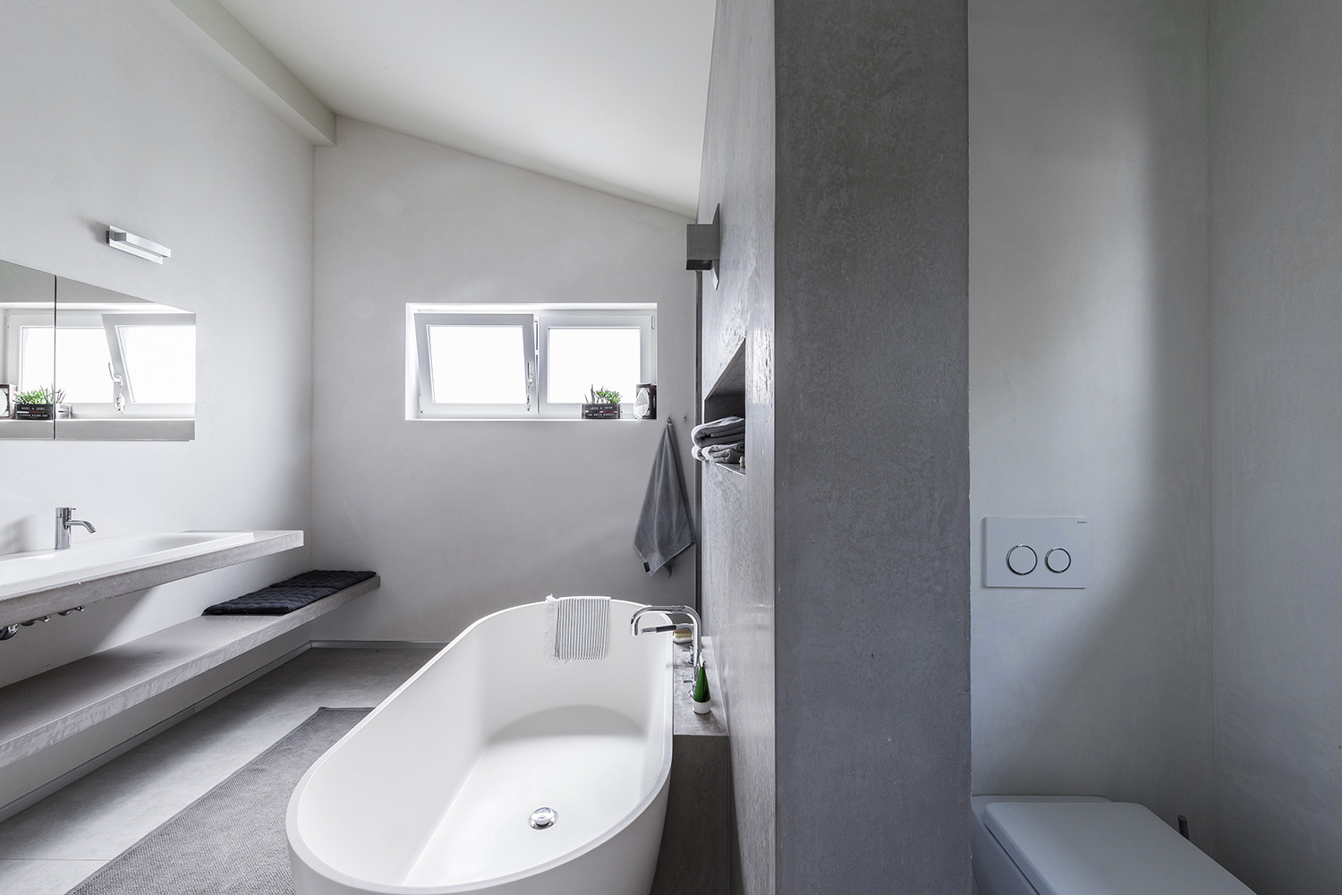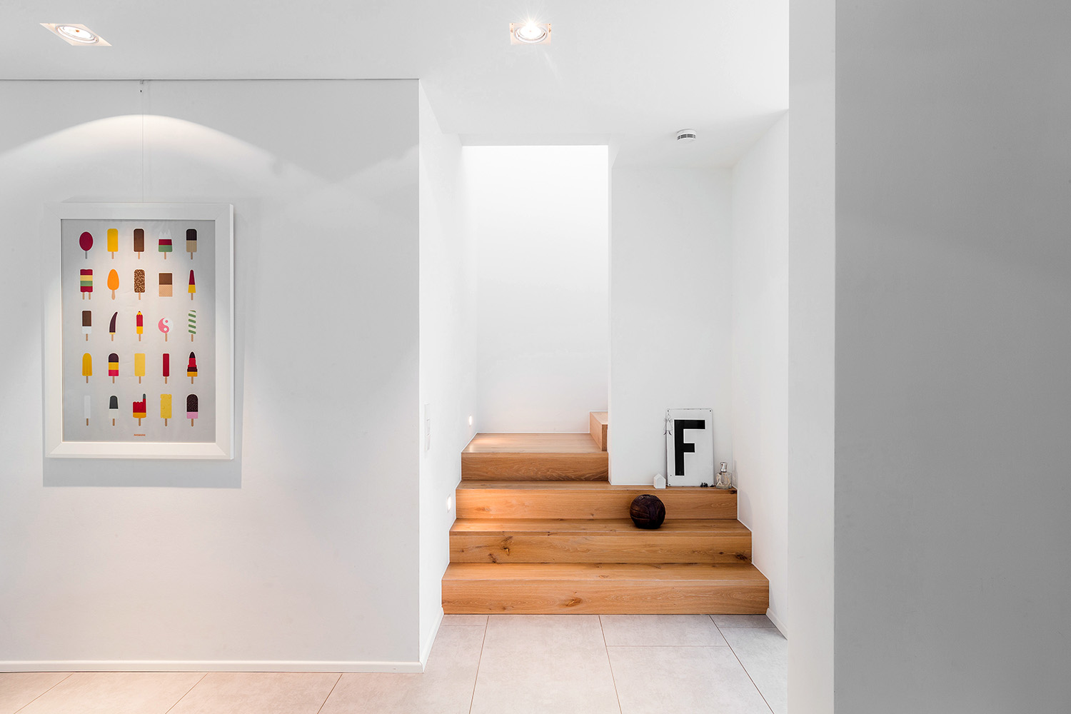 Ein schlichter langer Baukörper mit anschließender Garage und ein in das Wohnhaus integrierter Büroteil folgen der Grundstücksform. Ein Versatz im Erdgeschoß bildet einen geschützten Eingangsbereich aus. Hohe Raumhöhen und deckenhohe Fenster, sowie verschiedene Edelputze und Einbauten sind individuell geplant.