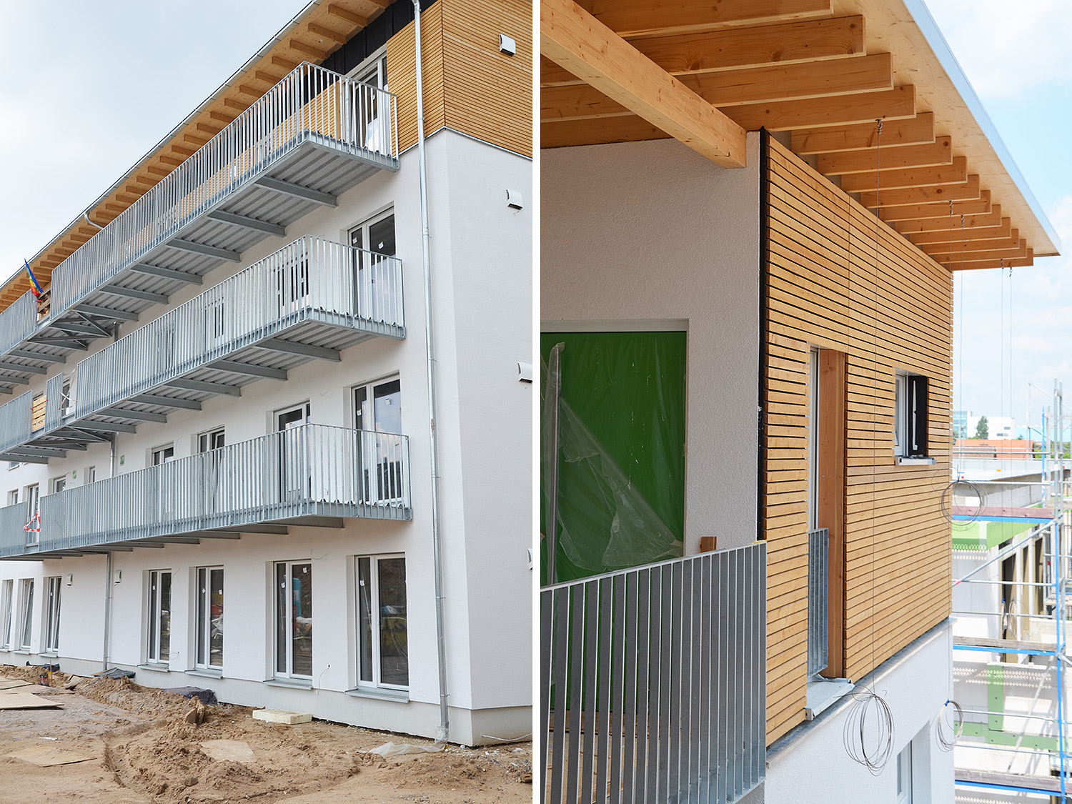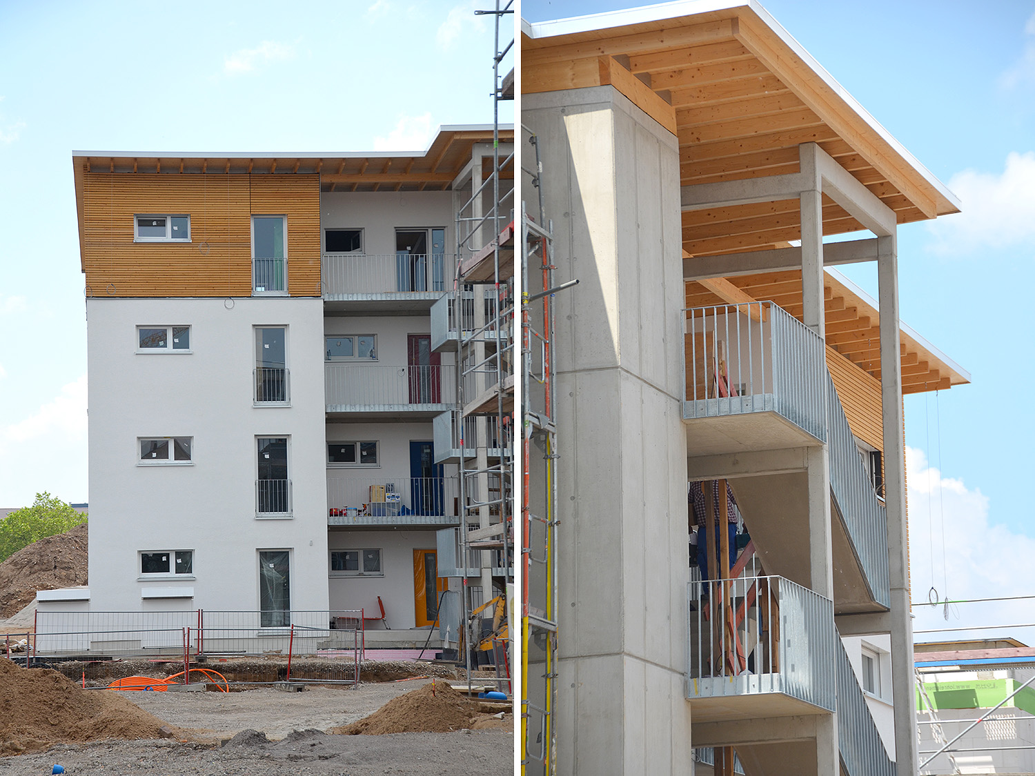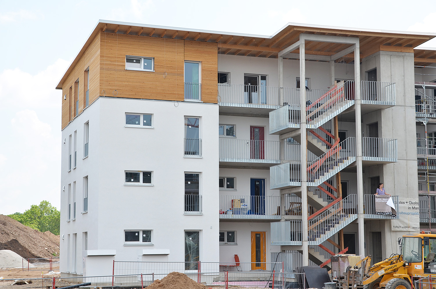 Darüberhinaus gibt es noch weitere bemerkenswerte Eigenschaften des Projektes. Bei dem 4-geschossigen Gebäude, das auf einem Konversionsgelände in Mannheim liegt, handelt es sich um eine Hybridbauweise. D.h. Holz- und Massivbauteile sind zusammen verarbeitet, jedes Material wird dort eingesetzt, wo es seine Stärken hat. Die Decken- und Wohnungstrennwände sind aus Stahlbeton, die Aussenwände aus Massivholz und das komplette Dachgeschoss aus Holz.