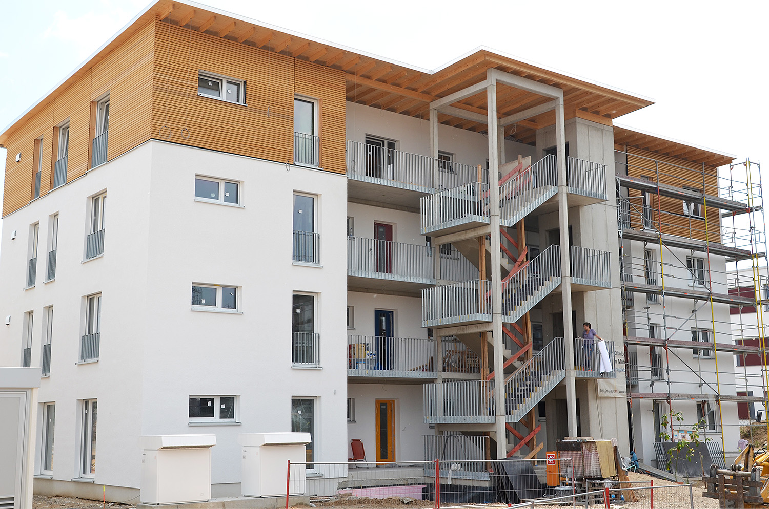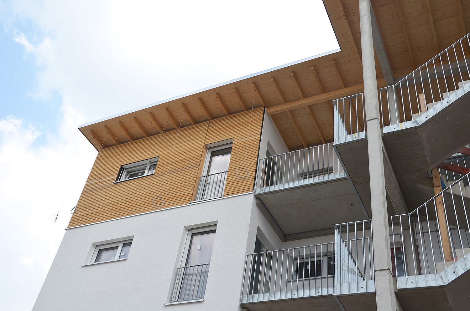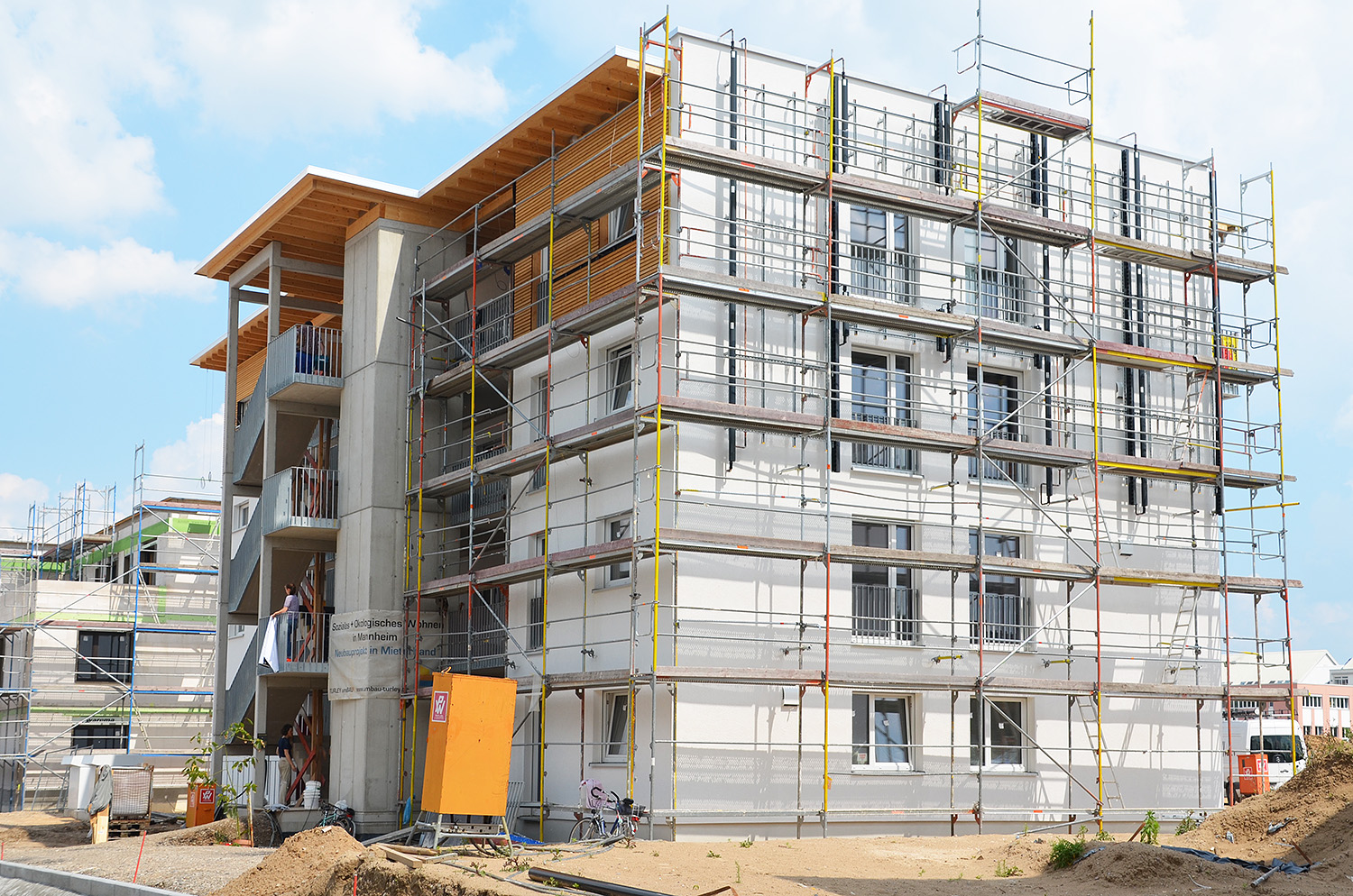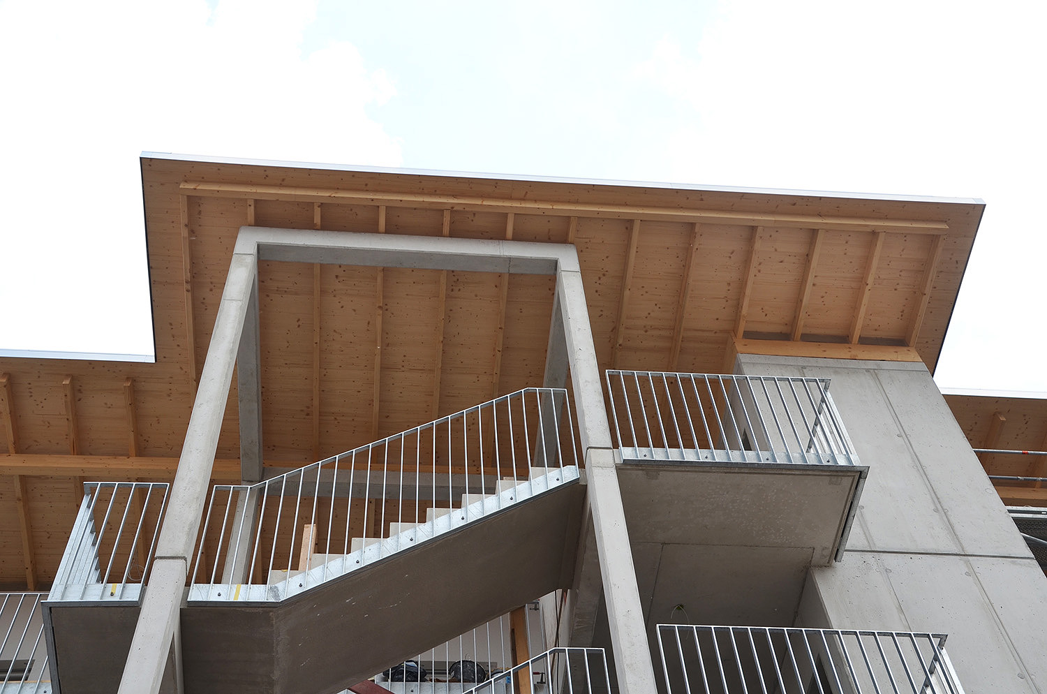 Darüberhinaus gibt es noch weitere bemerkenswerte Eigenschaften des Projektes. Bei dem 4-geschossigen Gebäude, das auf einem Konversionsgelände in Mannheim liegt, handelt es sich um eine Hybridbauweise. D.h. Holz- und Massivbauteile sind zusammen verarbeitet, jedes Material wird dort eingesetzt, wo es seine Stärken hat. Die Decken- und Wohnungstrennwände sind aus Stahlbeton, die Aussenwände aus Massivholz und das komplette Dachgeschoss aus Holz.