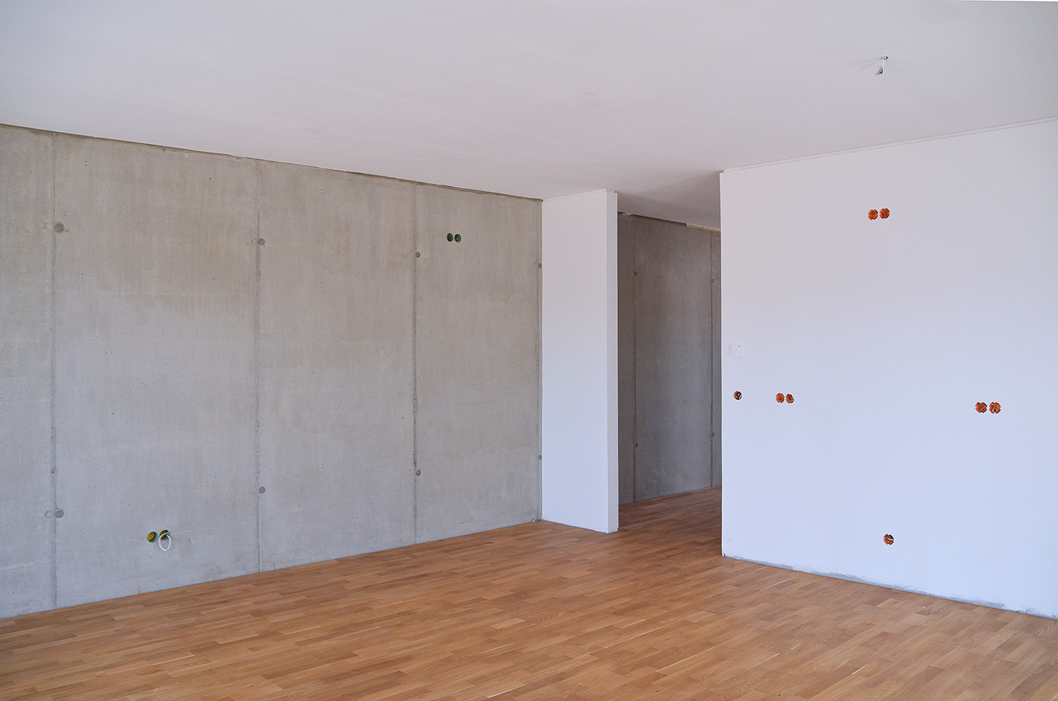 Das Mehrfamilienhaus wird durch einen Laubengang und einem außenliegenden Treppenhaus erschlossen und stellt gleichzeitig den halböffentlichen Bereich zur privaten Wohnfläche dar. Insgesamt bietet das Haus 12 Wohneinheiten. Eine Wohneinheit ist als Gemeinschaftsfläche vorgesehen. Alle Bewohner, die vor der Errichtung des Gebäudes dabei waren, wurden in die Planungen mit einbezogen und so entstanden ganz individuelle Grundrisse für die Mieter. Die Wohnungen sind ca. 60 - 120 qm gross, insgesamt gibt es 6 verschiedene Größen.