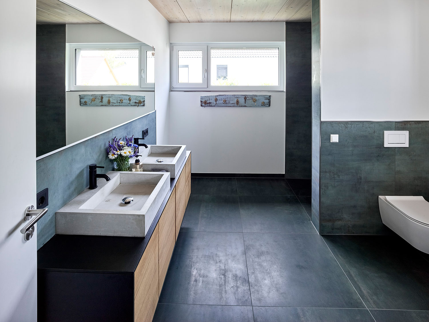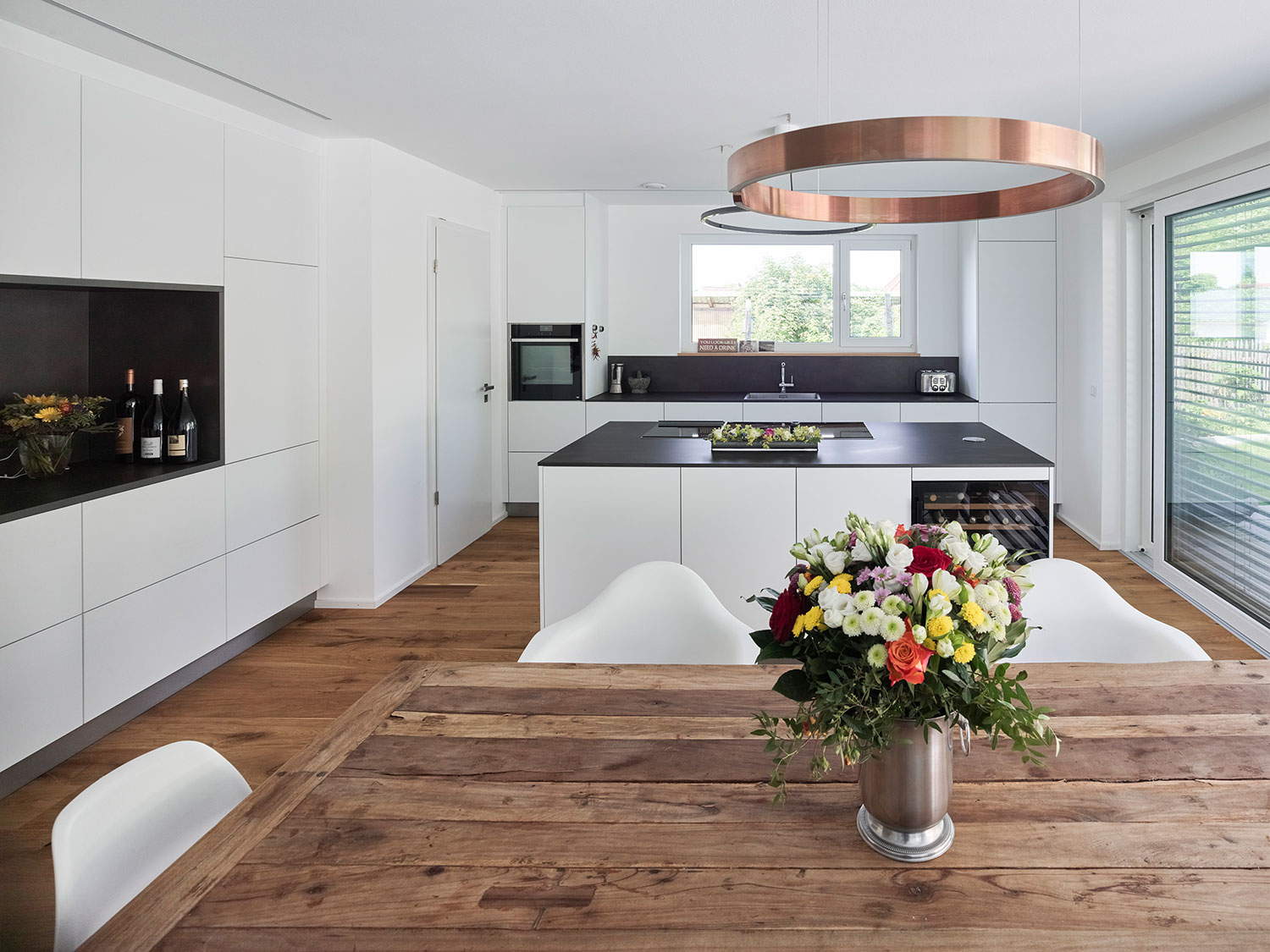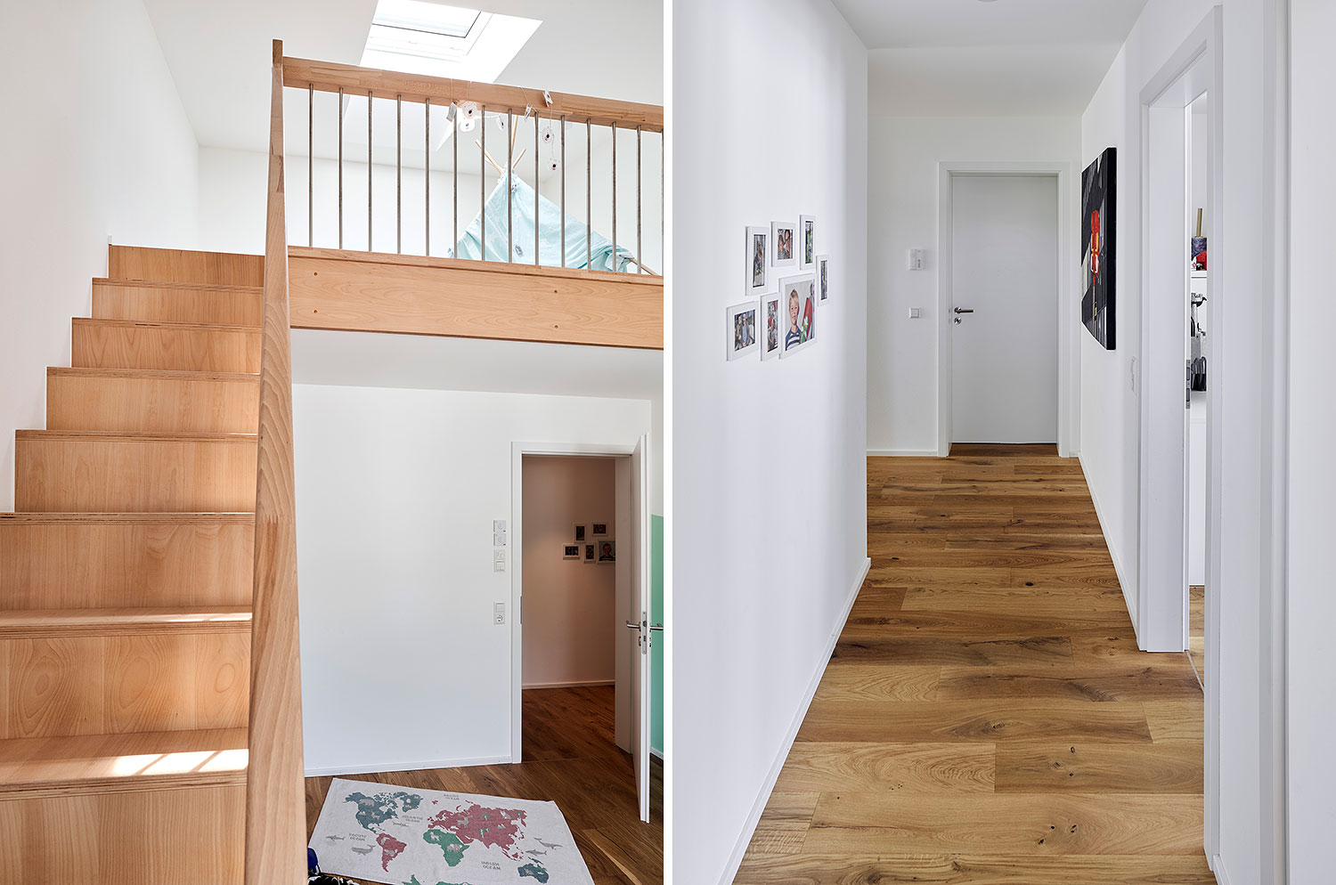 Im Erdgeschoss befinden sich der Eingang der oberen Wohnung und die Einliegerwohnung. Im hinteren Hangbereich liegt ein Teilkeller. Eine große Wohnküche mit viel Glas und Bezug in den Garten liegt im Obergeschoss. Kinderzimmer mit eigenem Bad und Hochbettebenen finden hier ebenfalls Platz.