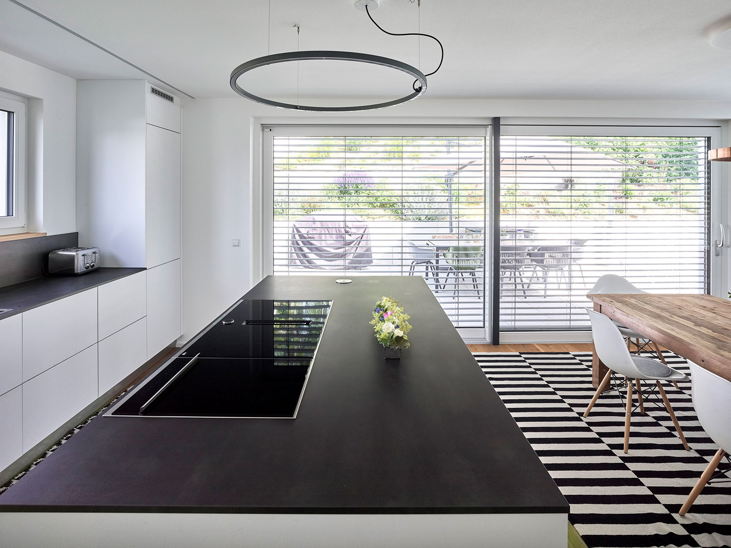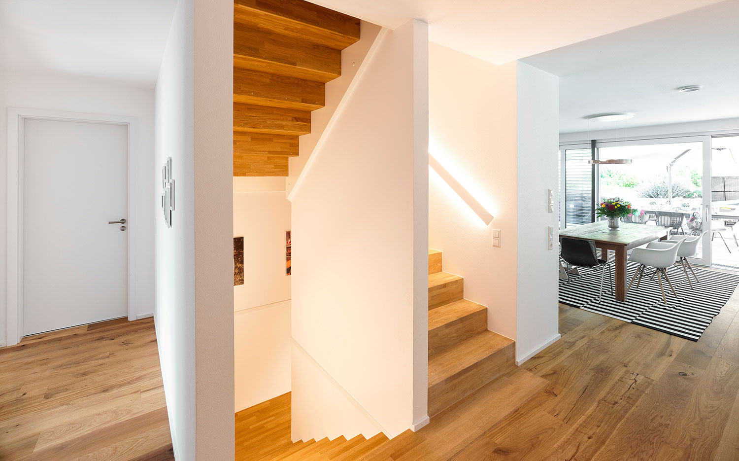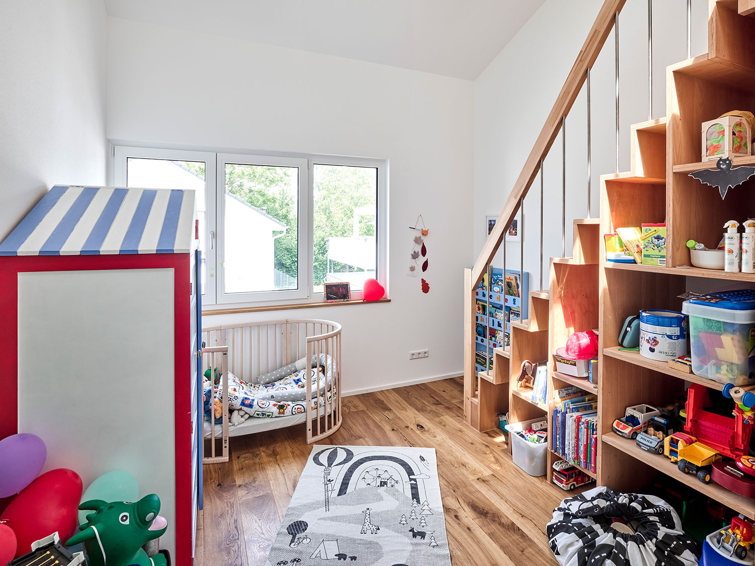 Im Erdgeschoss befinden sich der Eingang der oberen Wohnung und die Einliegerwohnung. Im hinteren Hangbereich liegt ein Teilkeller. Eine große Wohnküche mit viel Glas und Bezug in den Garten liegt im Obergeschoss. Kinderzimmer mit eigenem Bad und Hochbettebenen finden hier ebenfalls Platz.