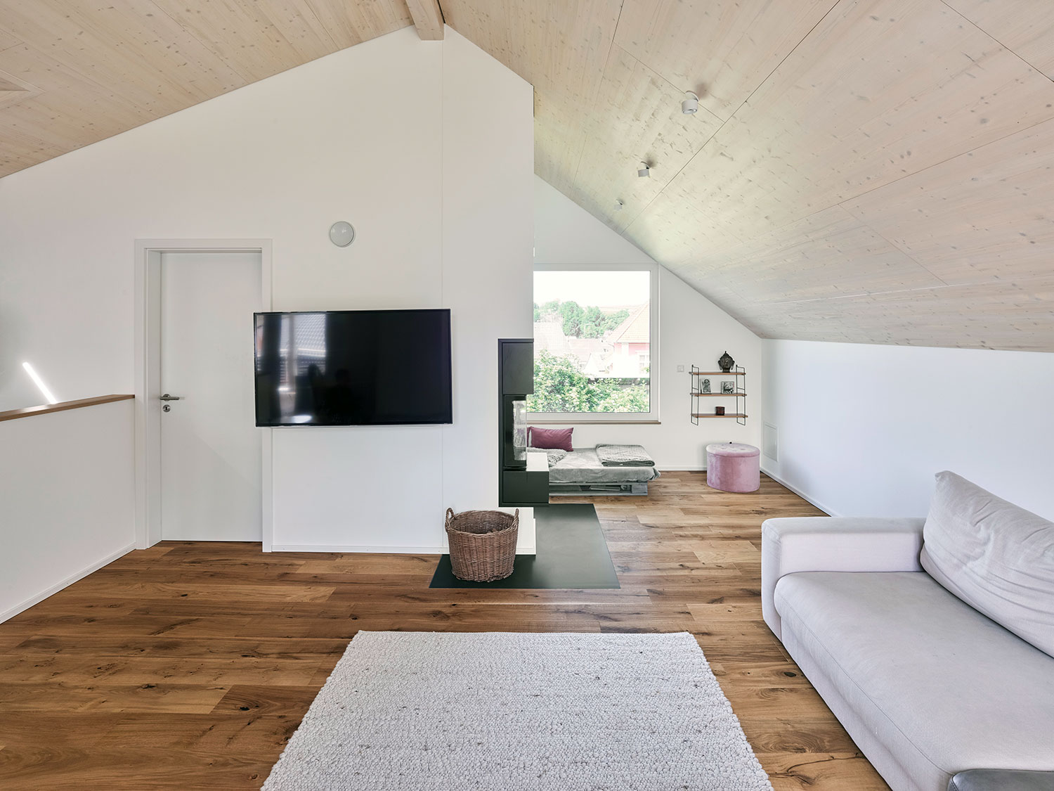 Mit dem versetzten First und den ungleich langen Dachseiten konnte das Haus am Hang entlang entwickelt werden. Die Grundrisse erstrecken sich über drei Geschosse.