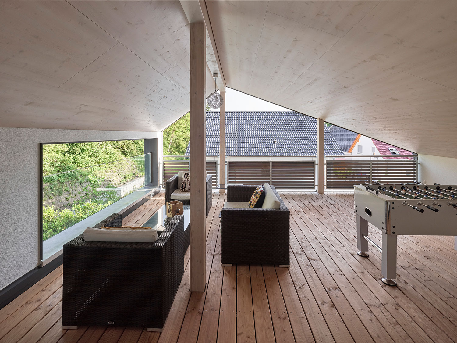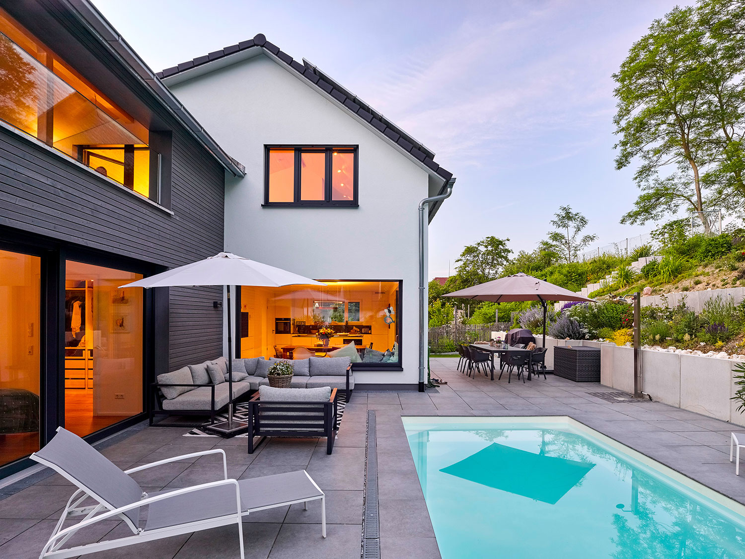 In einem Seitenflügel, der den Garten vor Einsicht schützt, liegt der Bereich der Eltern. Der Wohnraum im Dachgeschoss wird durch eine wettergeschützten, und überdachte Dachterrasse erweitert und rundet das Konzept ab.