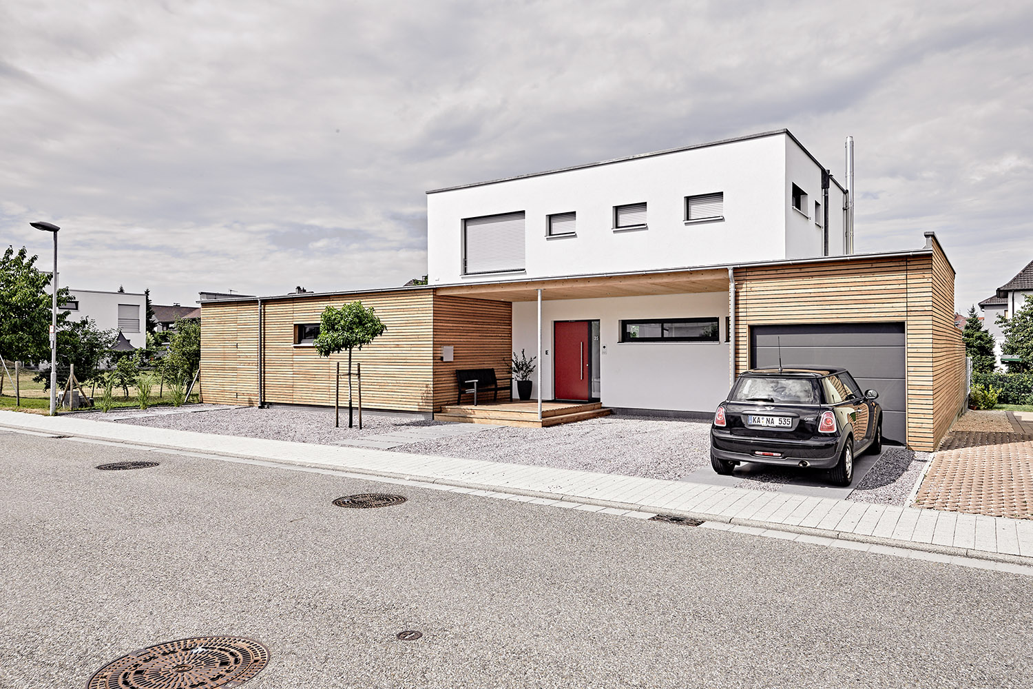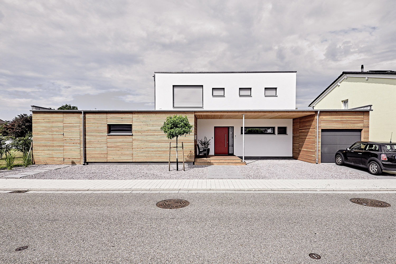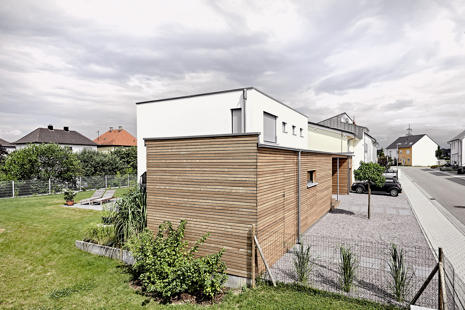 Ein holzverkleiderter eingeschossiger Querriegel entlang der Strasse beherbergt Abstellfläche, Haustechnik und Eingangsüberdachung und endet an der Grenze mit der Garage. Er bildet den halböffentlichen Bereich aus und schützt die Wohnräume im anschließenden Haupthaus.